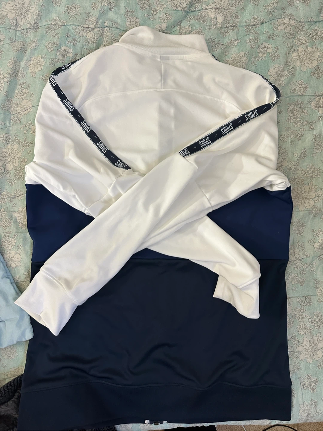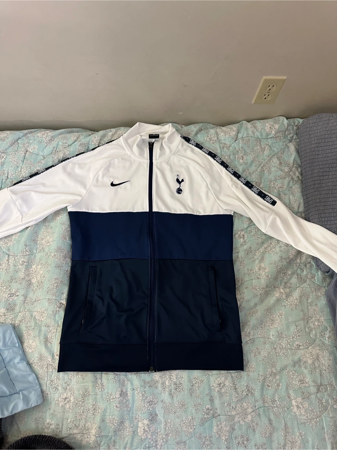2019/20 Tottenham Hotspur track jacket with SPURS branding on the sleeves. Full zip closure with pockets. White, navy blue, and dark navy colour blocking.