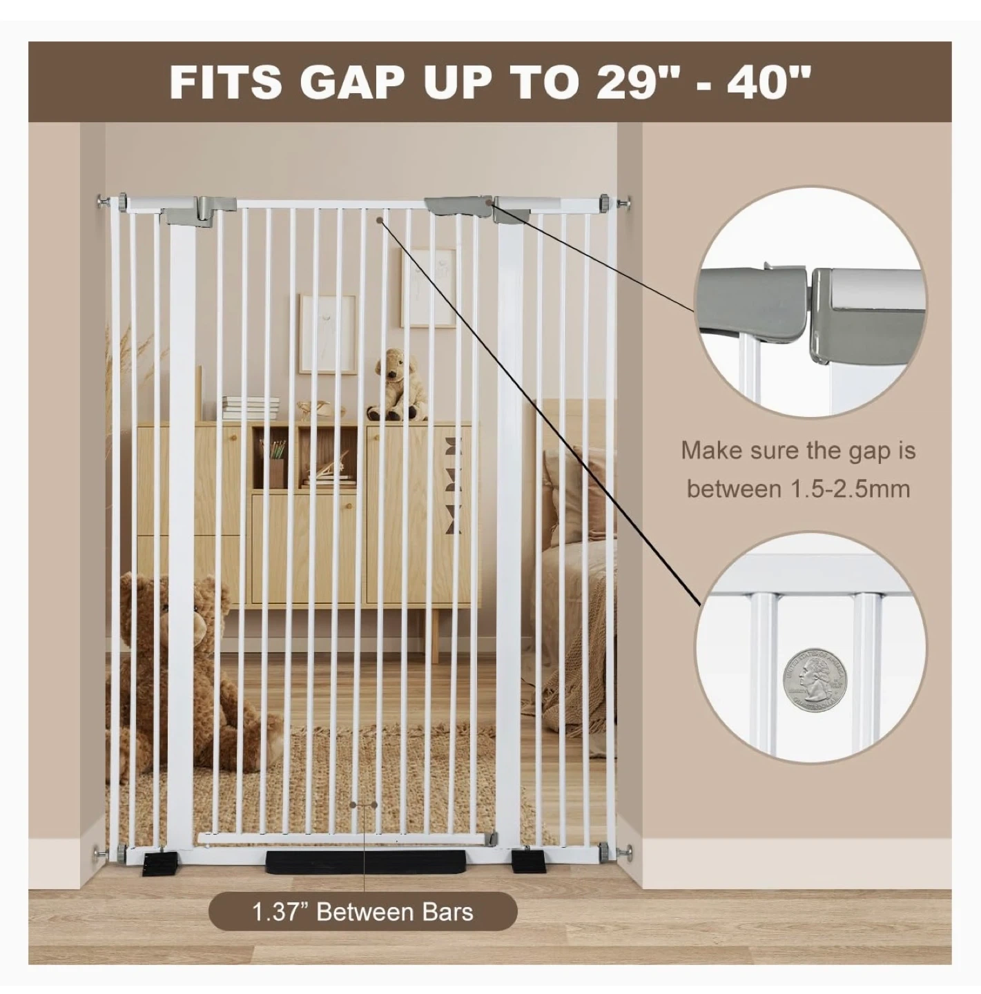 Ultra Narrow Spacing - With a spacing of only 1.37 inches between the tubes, our gate ensures that pets cannot get out of the gate or stuck their head between it. This ultra-narrow design provides maximum safety for your pets. The package also includes two encryption rods to close the gap of expand area.