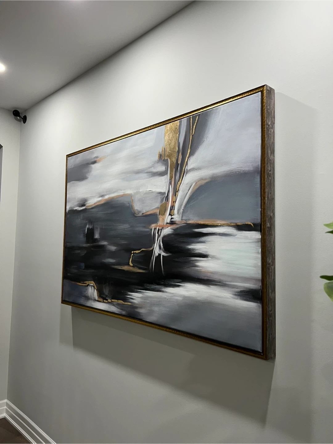 Beautiful abstract painting with a grey, black, and gold colour scheme. It's a great piece to add some modern flair to your home decor!