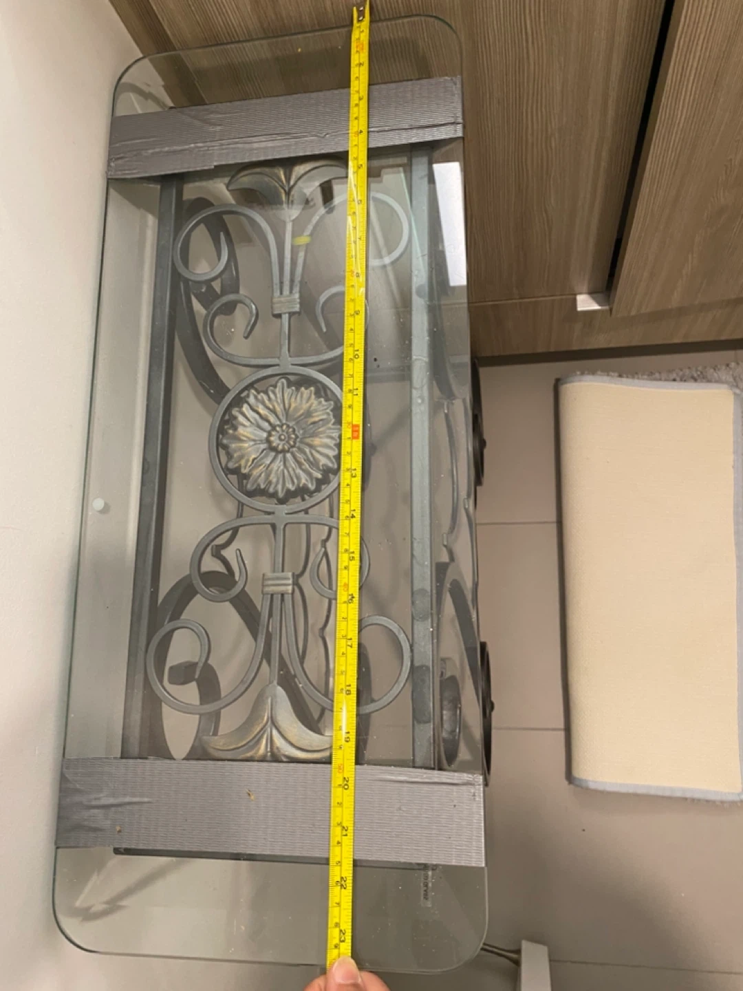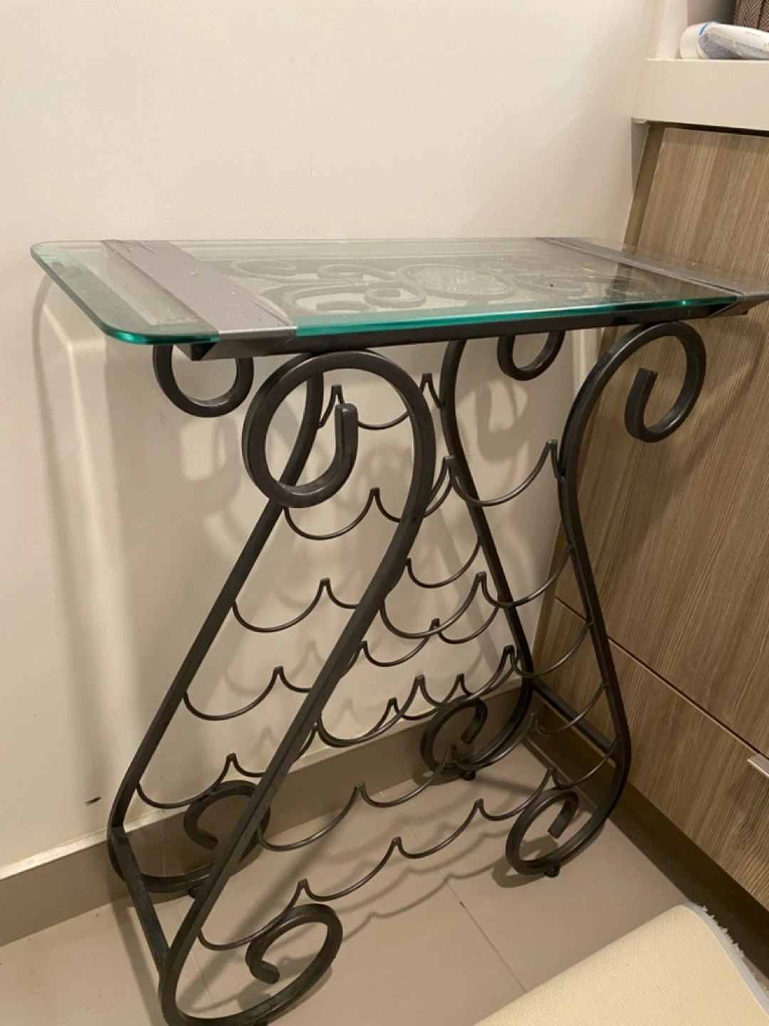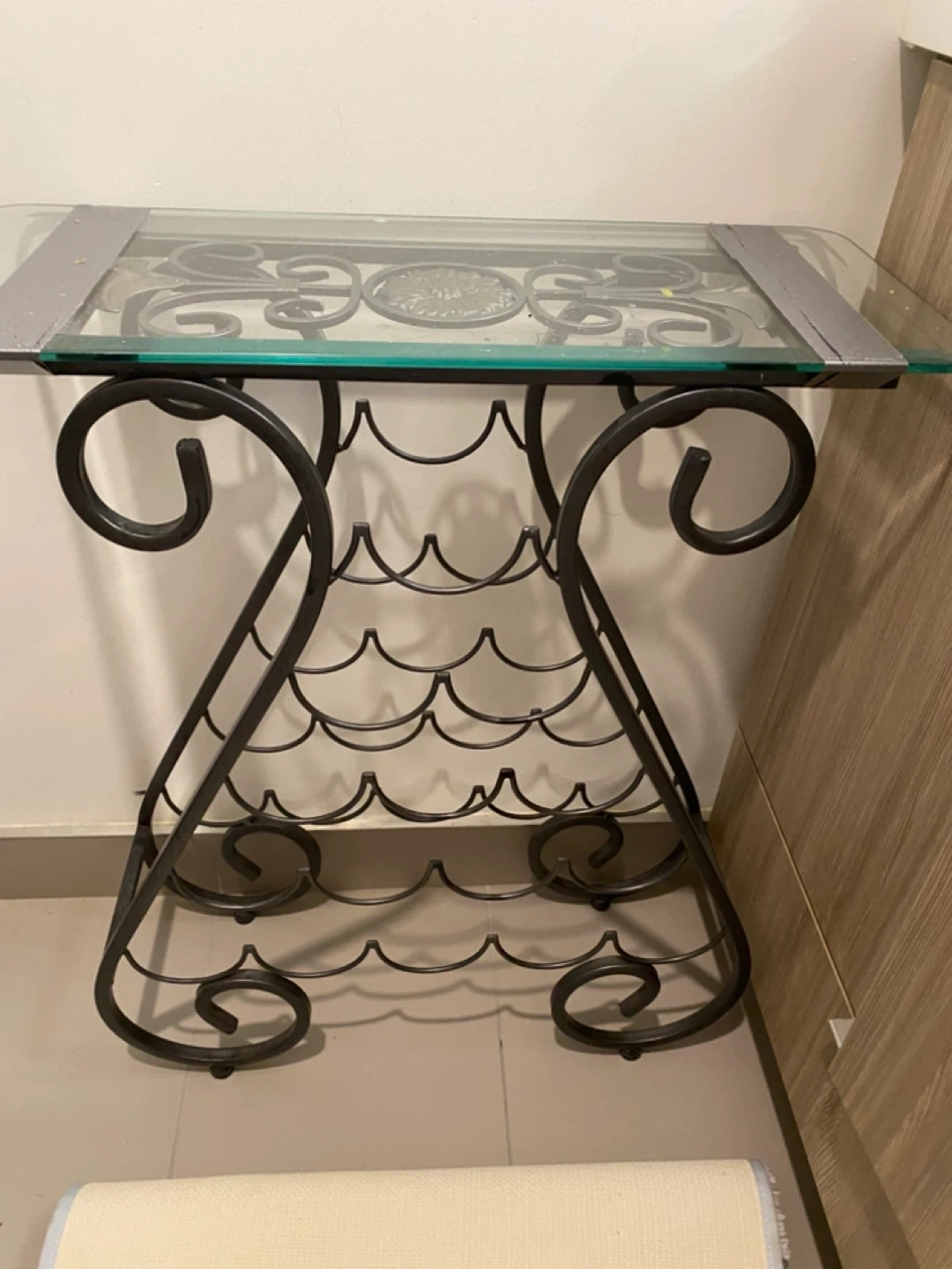 This wine rack table features a glass top and decorative metal scrollwork. It has a metal frame with a capacity for multiple wine bottles. It's a unique piece for your home!