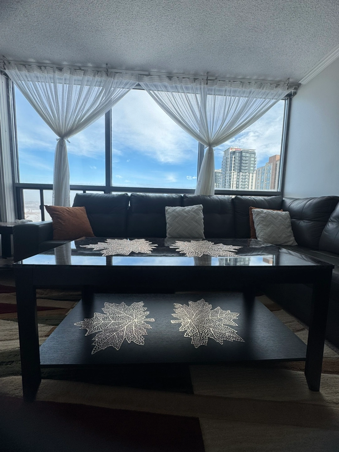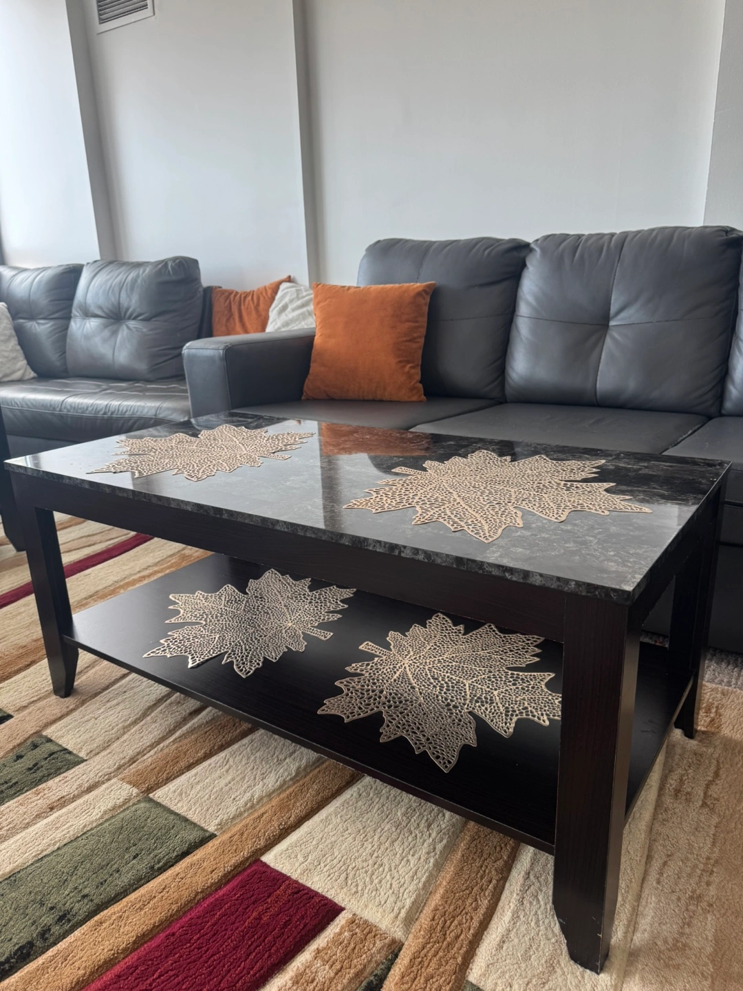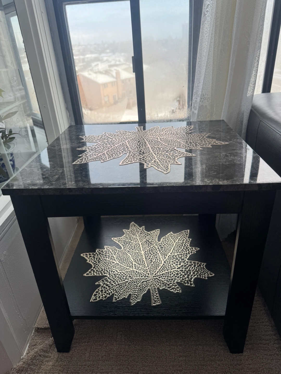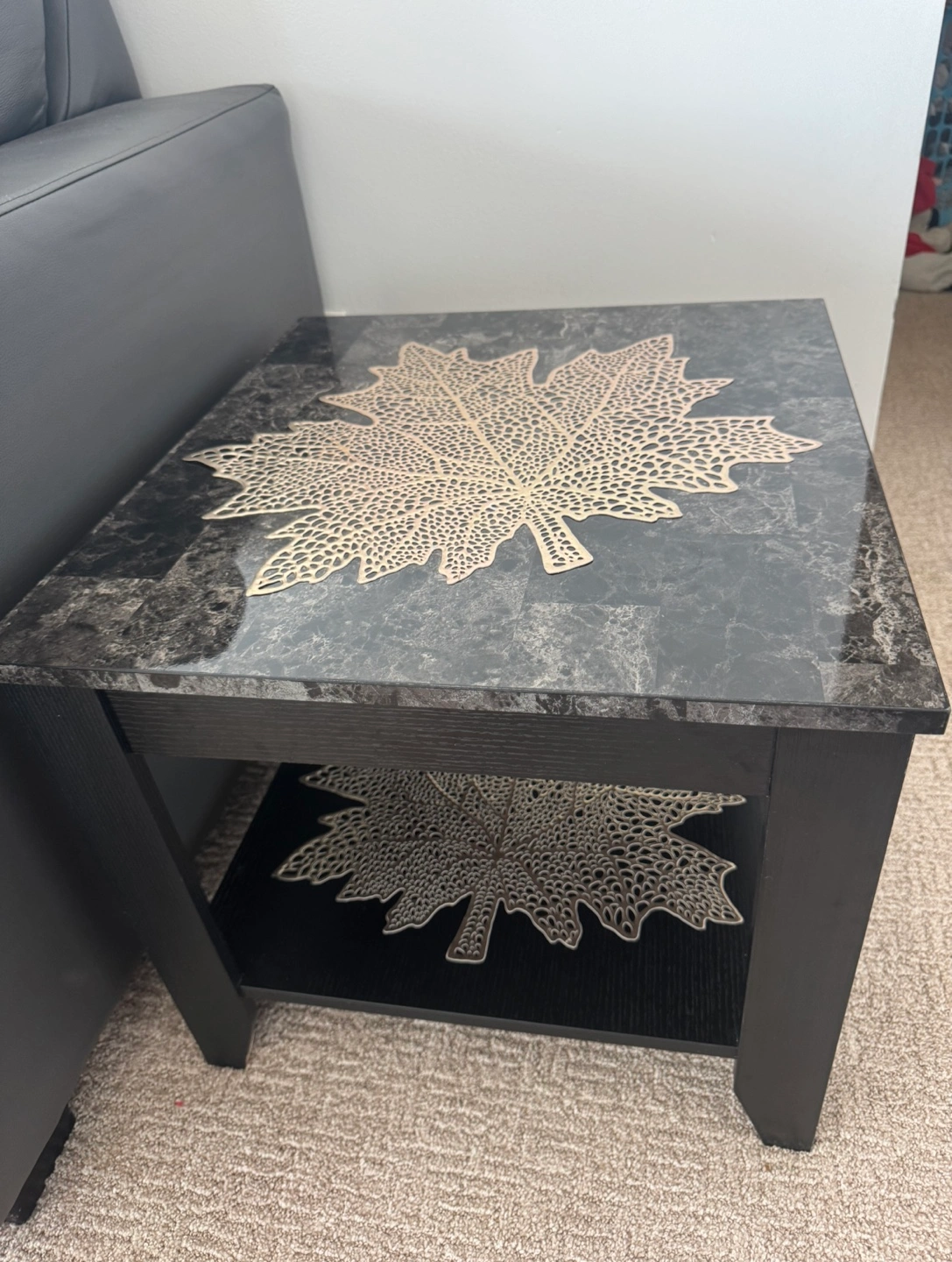 4 set of Square coffee table. Black frame. Granite top. Lower shelf. Leaf-design placemats included.