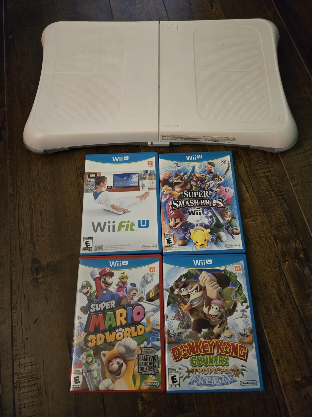 Selling a selection of Wii U Games. $25 each or the group for $75. Includes the Wii Fit U game with the balance board. Great for getting in shape and having fun! Also included are Super Smash Bros, Super Mario 3D World, and Donkey Kong Country Tropical Freeze