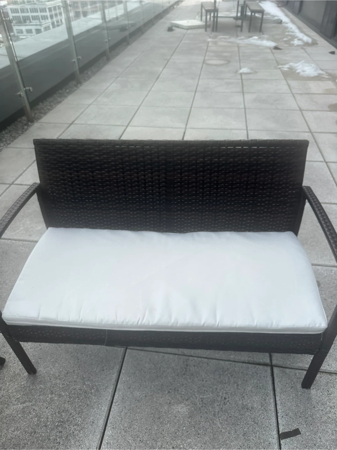 This outdoor loveseat has a brown wicker frame and comes with a white cushion. It's a comfortable two-seater perfect for patios or balconies. The wicker construction is durable for outdoor use.