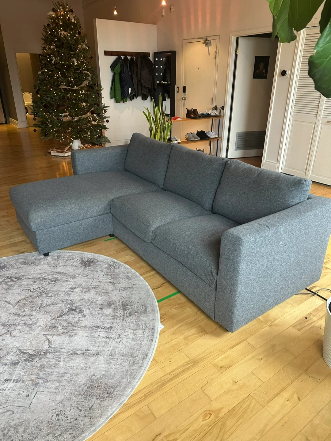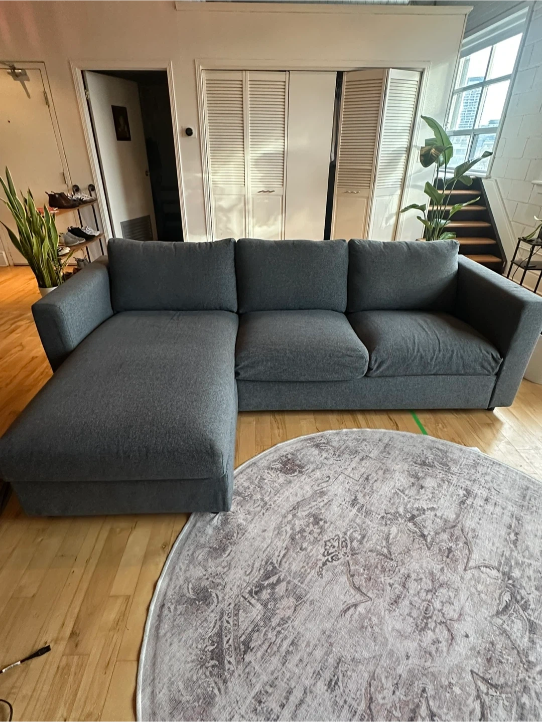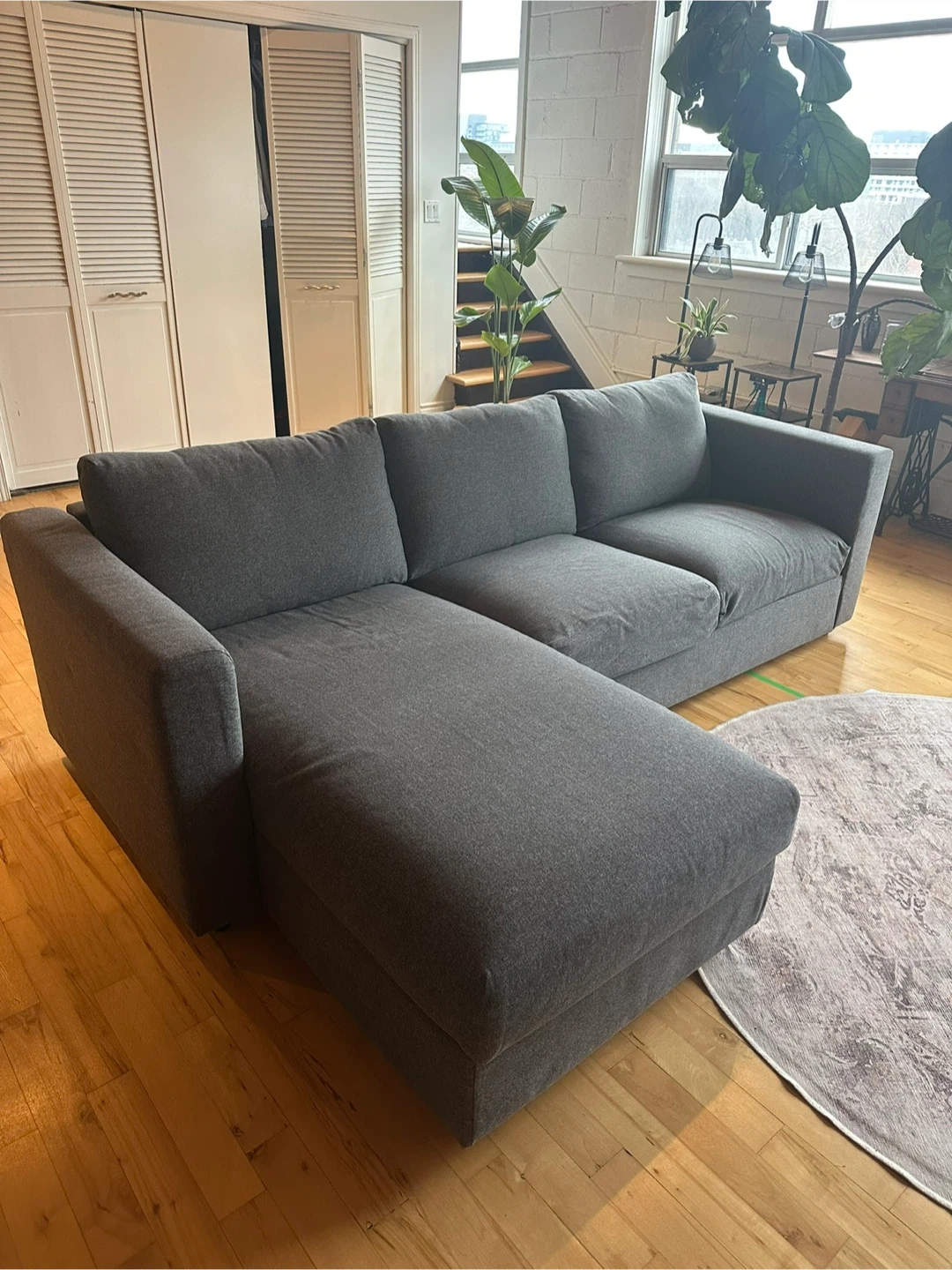 This grey sectional sofa (IKEA Finnala) features a chaise for extra lounging. Moved to a new space and this couch no longer fits. It’s in great condition and I am sad to part with it!