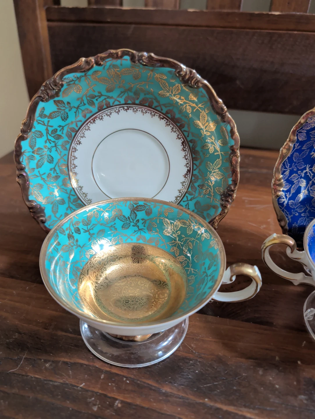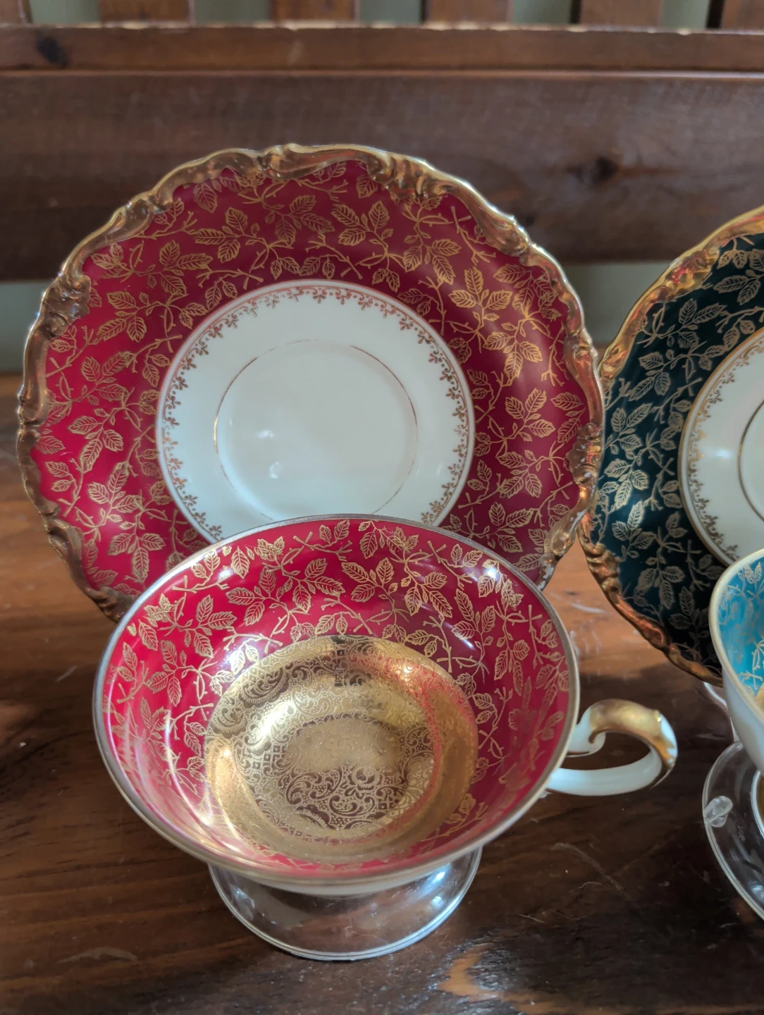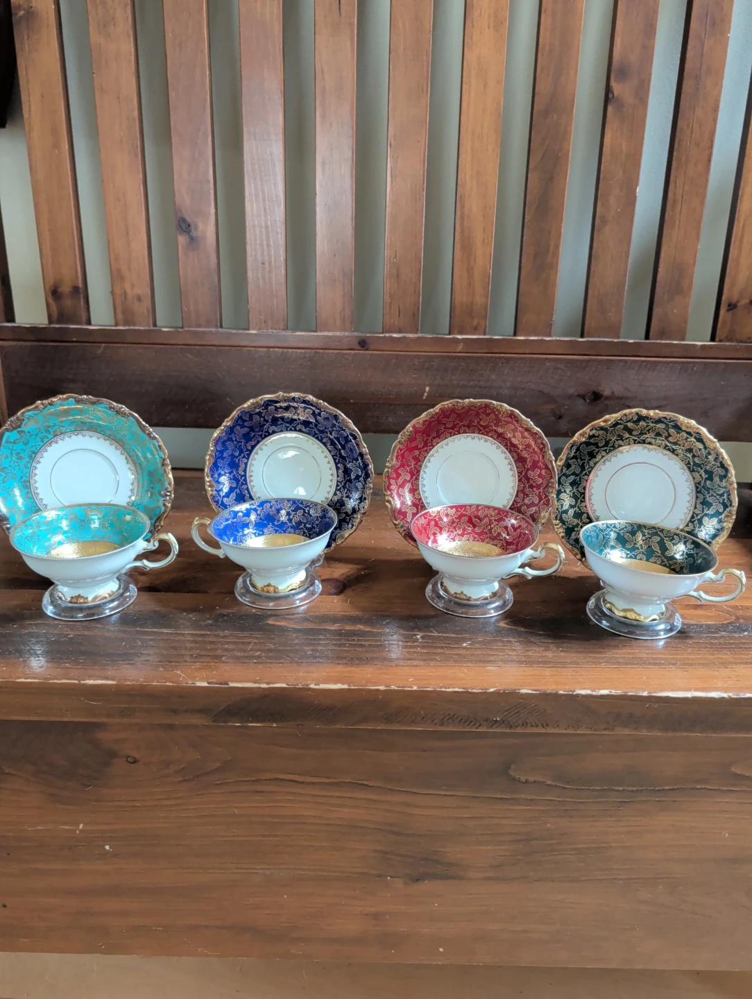 This is a set of four vintage teacups and saucers, each with a unique coloured design and gold leaf accents. They're perfect for afternoon tea or for adding a touch of elegance to your home decor. These pieces are made of porcelain.