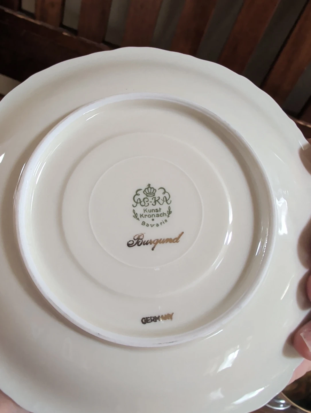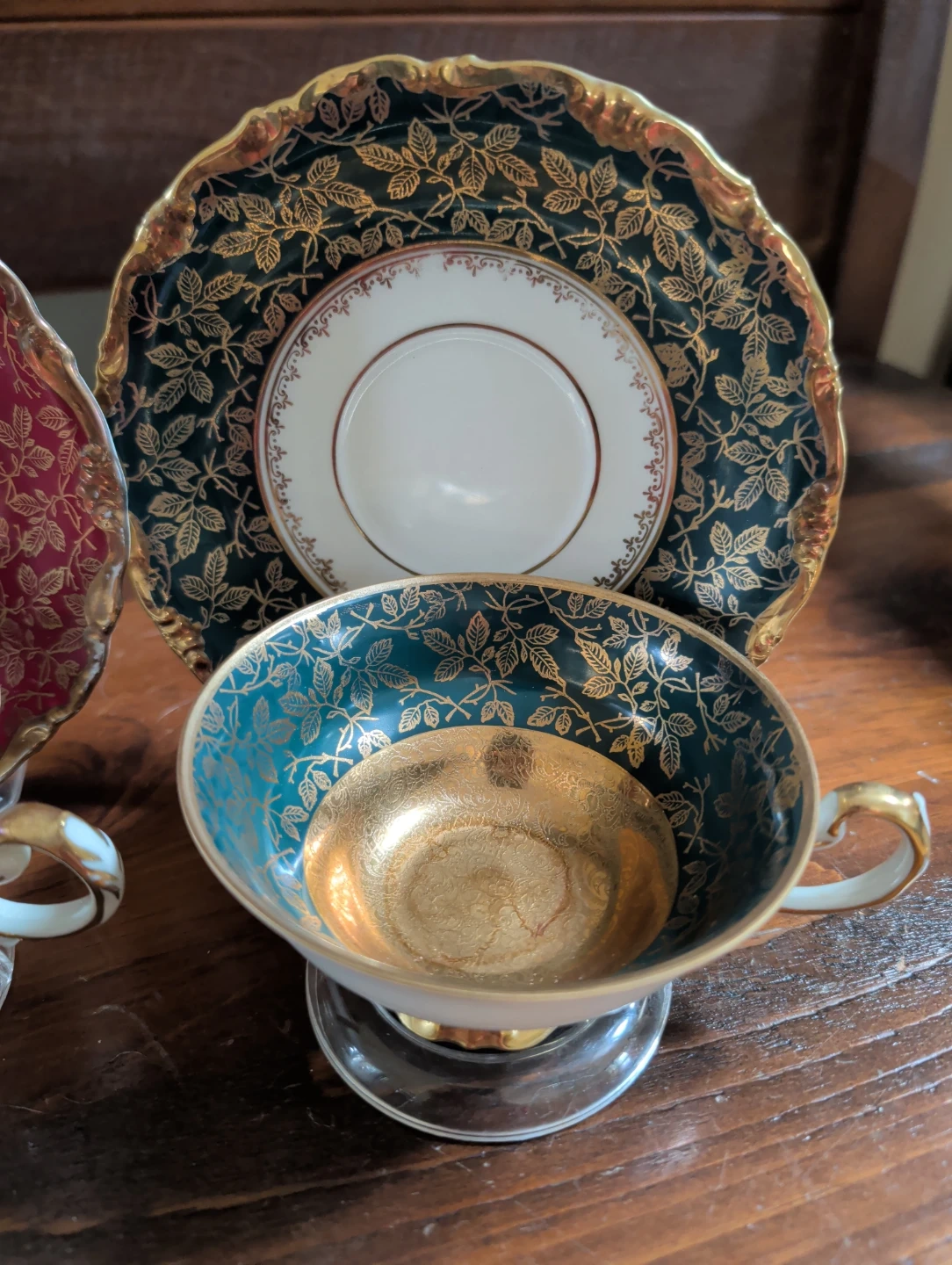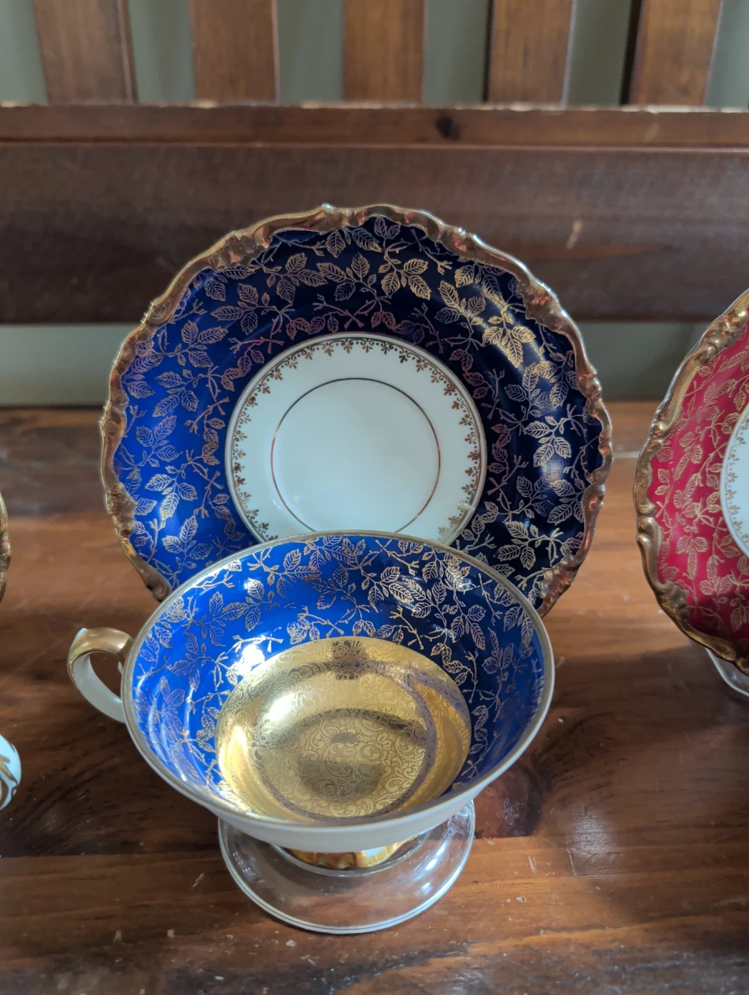 This is a set of four vintage teacups and saucers, each with a unique coloured design and gold leaf accents. They're perfect for afternoon tea or for adding a touch of elegance to your home decor. These pieces are made of porcelain.