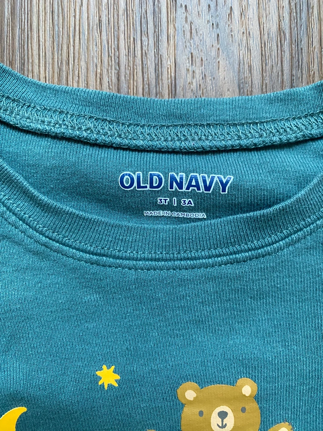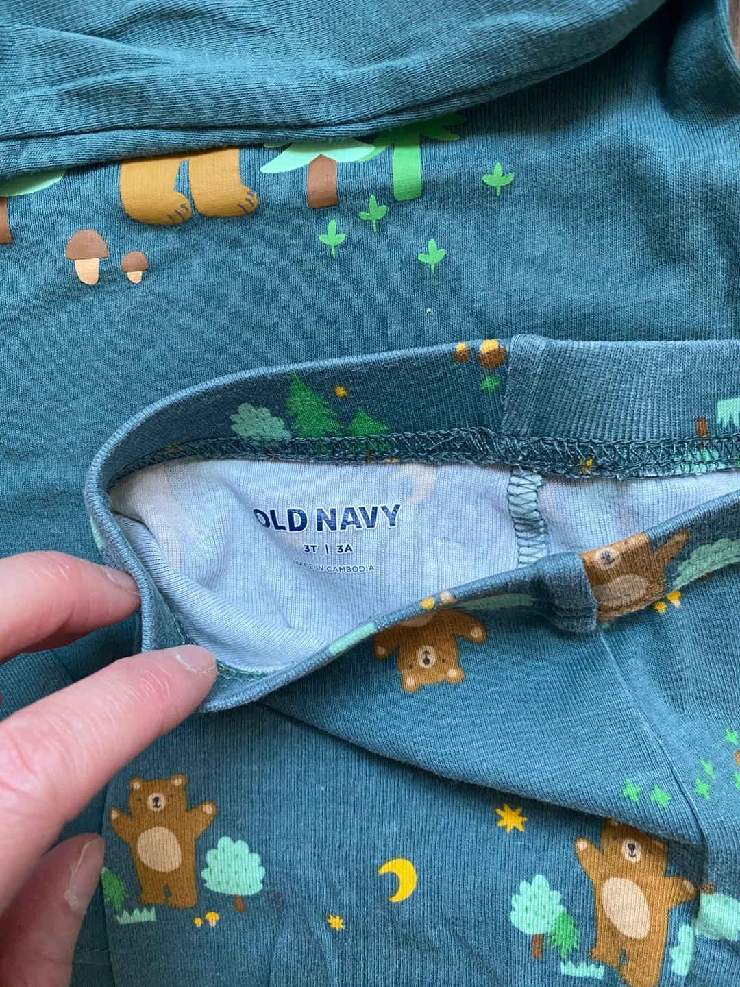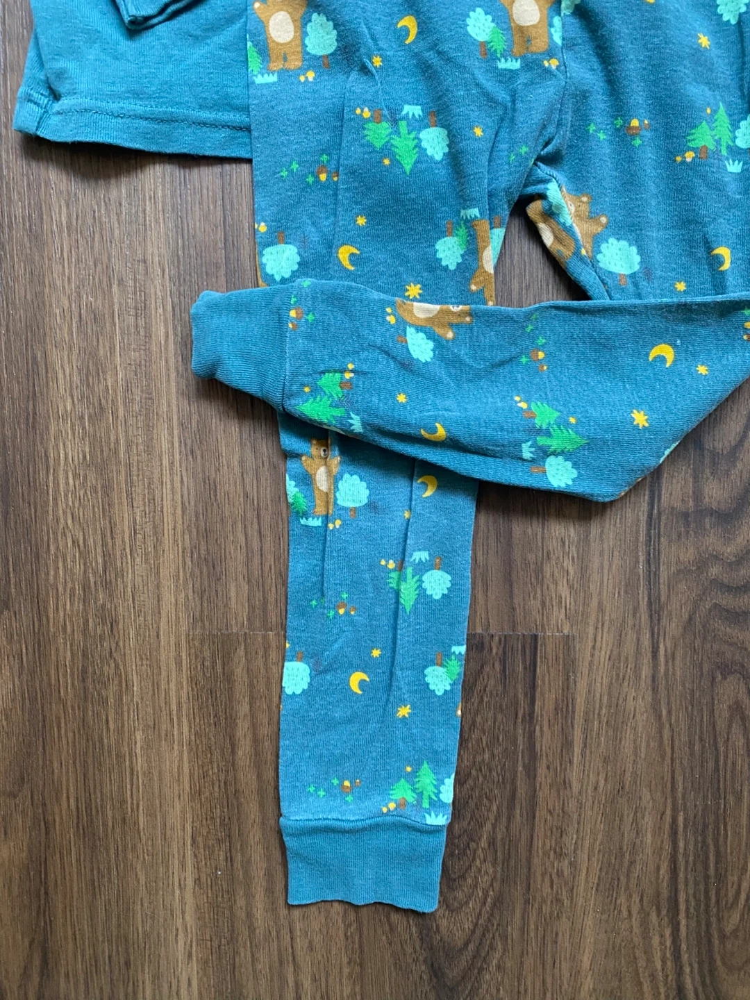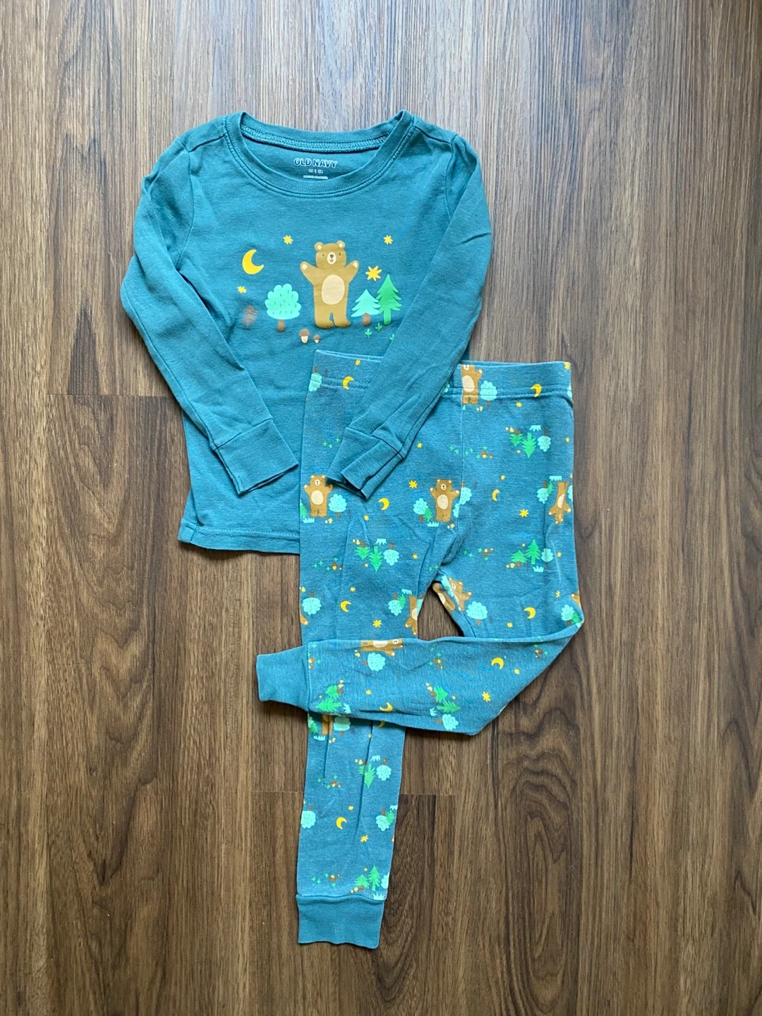 This Old Navy pajama set for kids is size 3T and features a cute bear and forest print. It's made for comfortable sleep. Great for toddlers who love woodland critters!