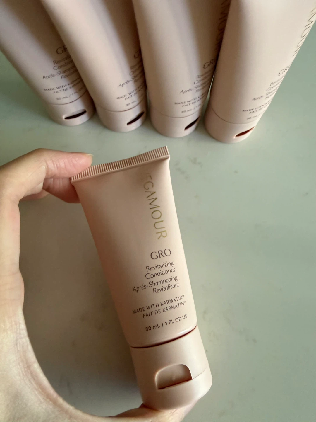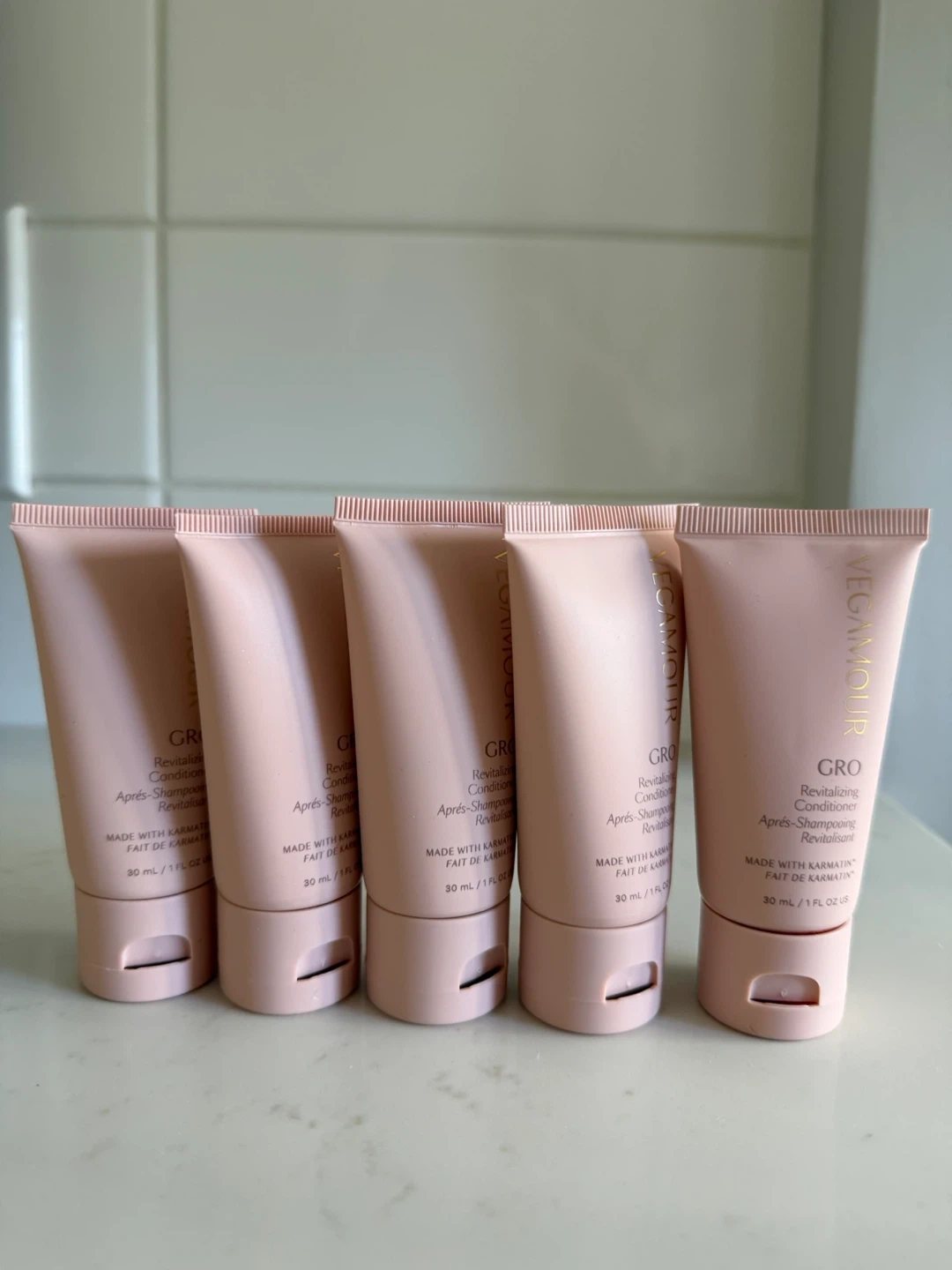 VEGAMOUR GRO Revitalizing Conditioner. Comes in 5 travel-sized tubes. Each tube is 30 ml (1 FL OZ US). Made with Karmatin.