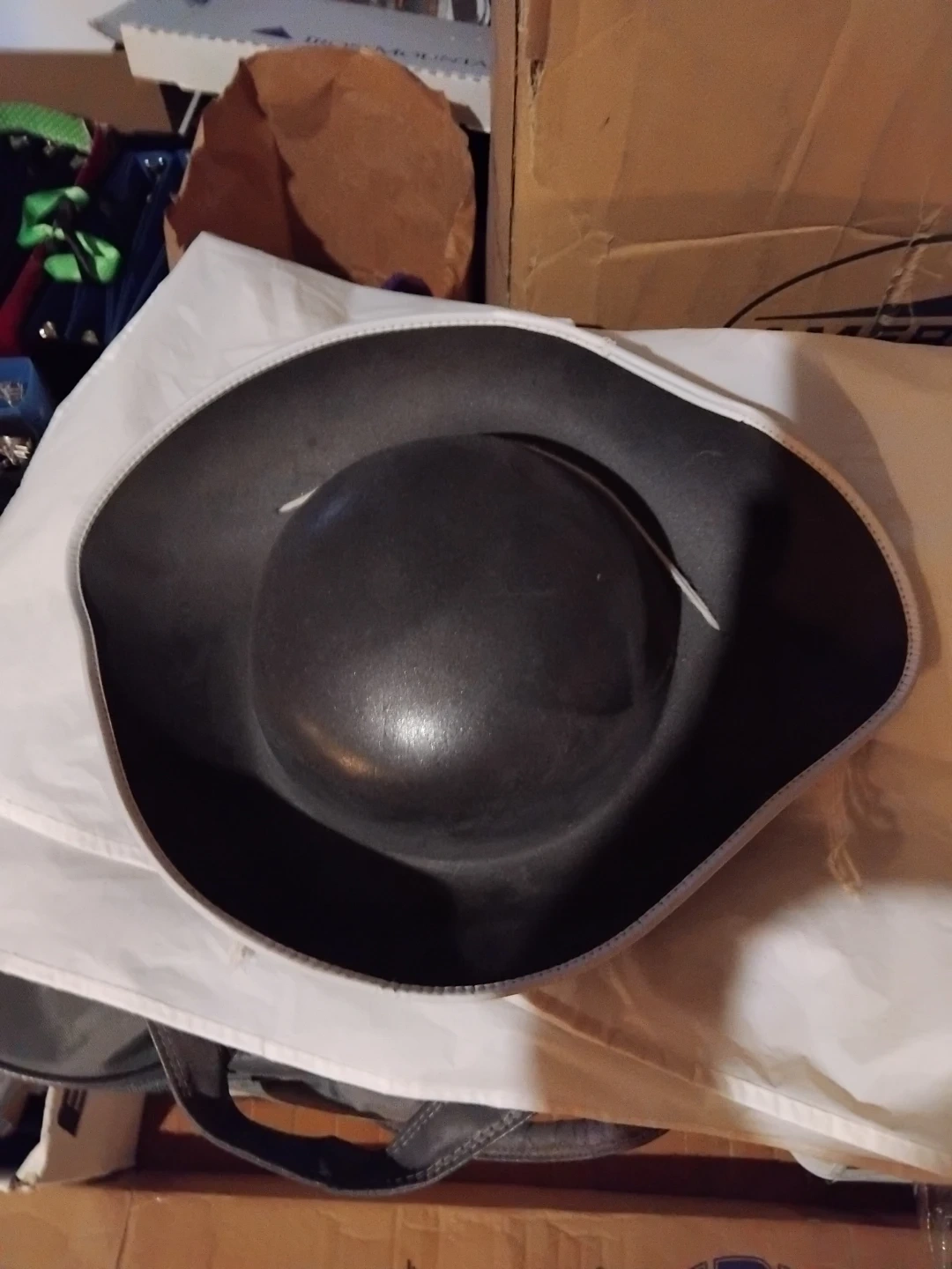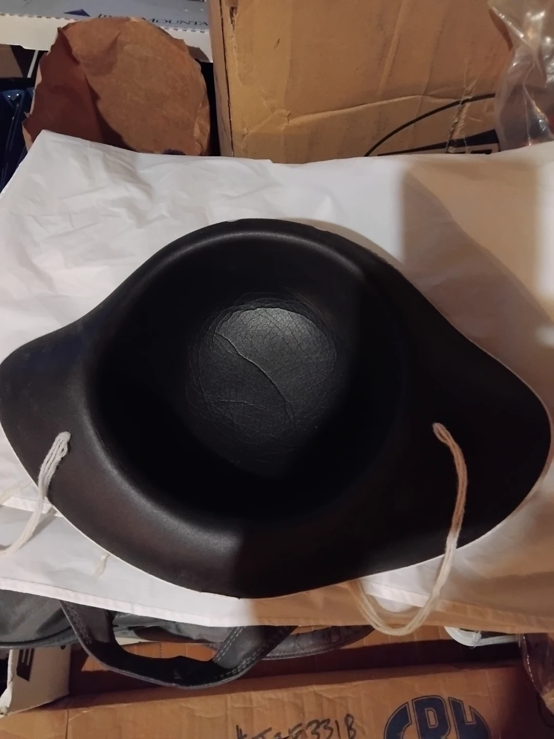 A black pirate hat featuring a white skull and crossbones emblem. It has a white trim around the brim and adjustable white ties. This hat's great for costumes or pretend play!