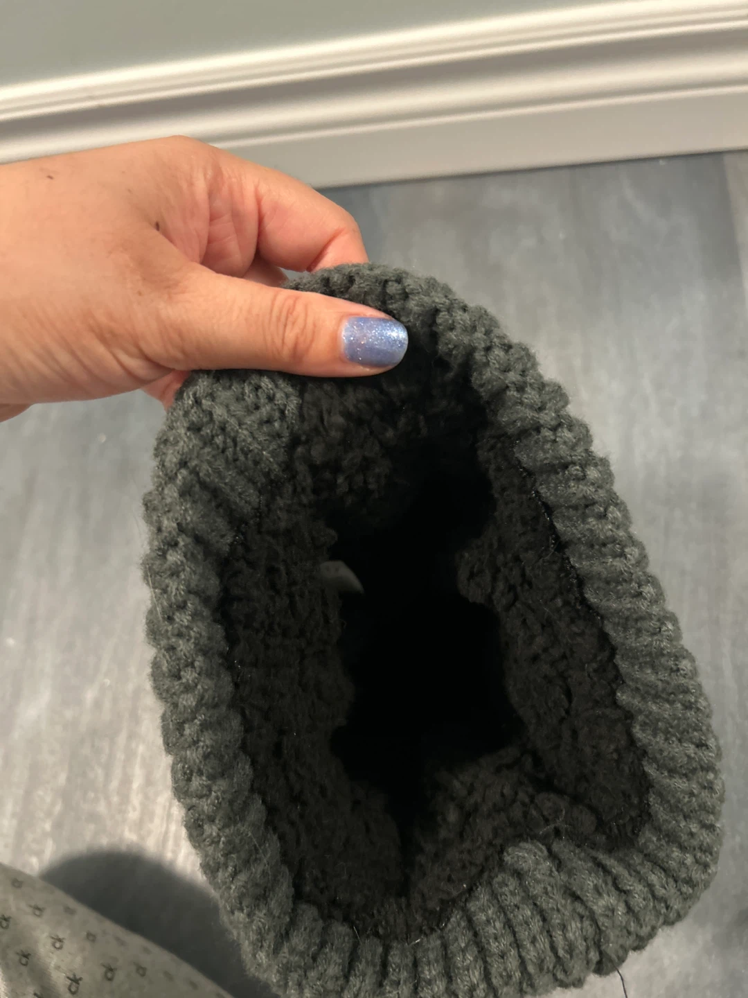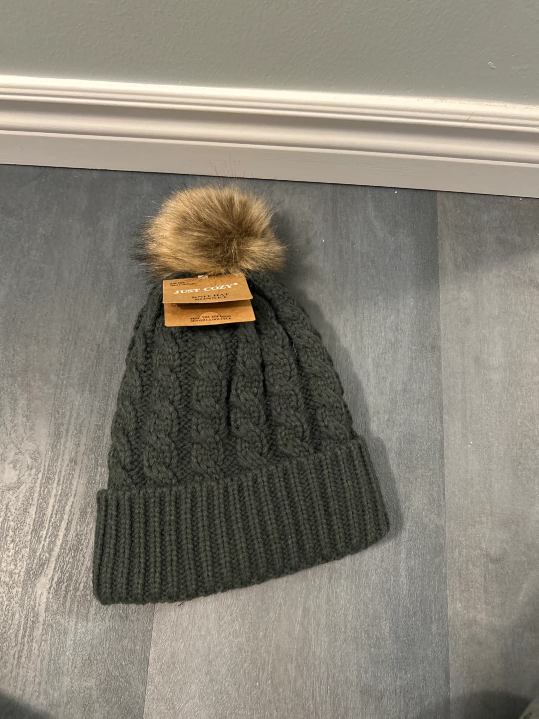Cozy and stylish grey knit beanie from Just cozy This beanie features a cute pom pom on top and is perfect for keeping warm during the colder months. It's in great condition and ready to be worn