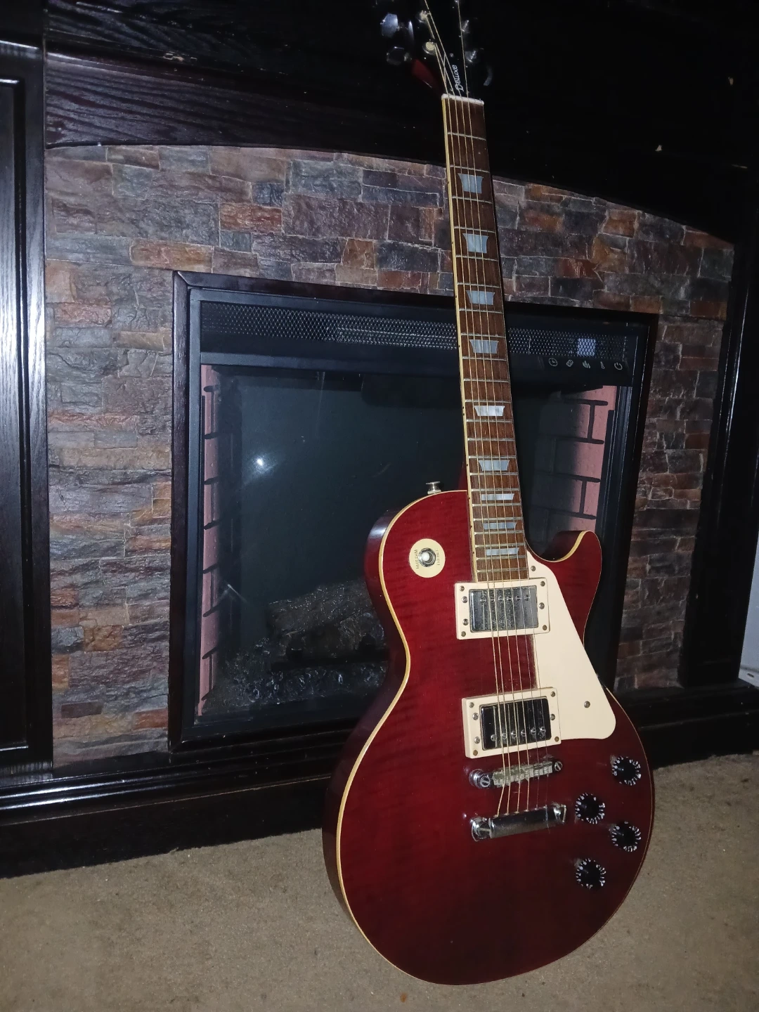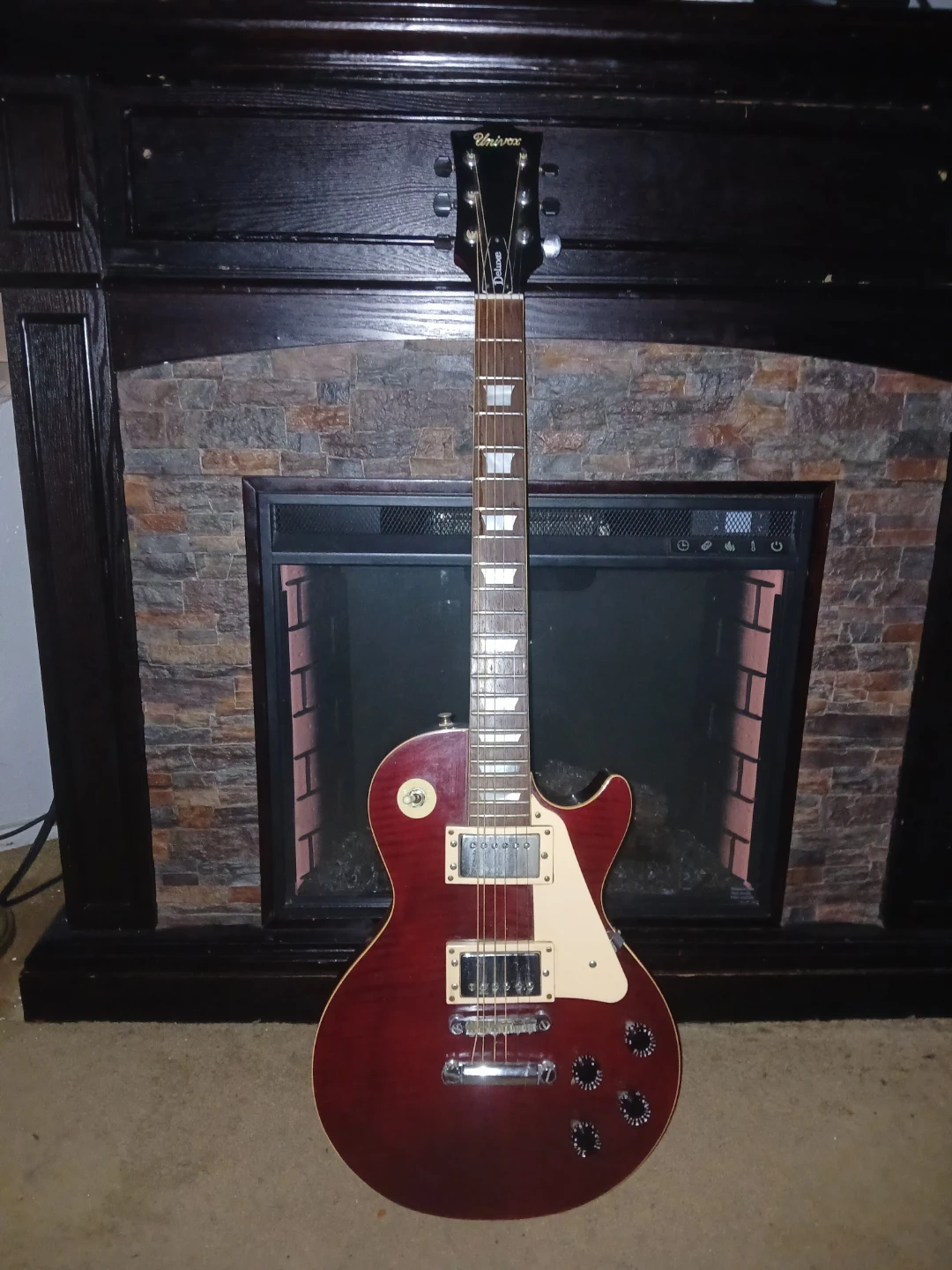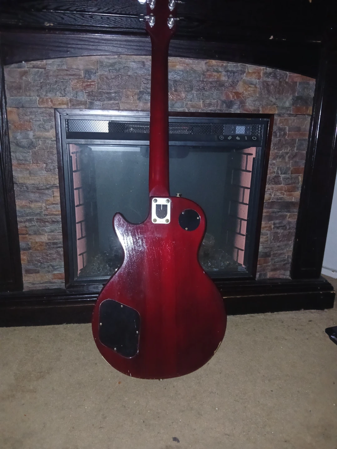 This is a used UnivoX electric guitar with a beautiful red burst finish. It features a classic Les Paul style body. Includes a tremolo bridge and two humbucker pickups. Guitar is fully functional.