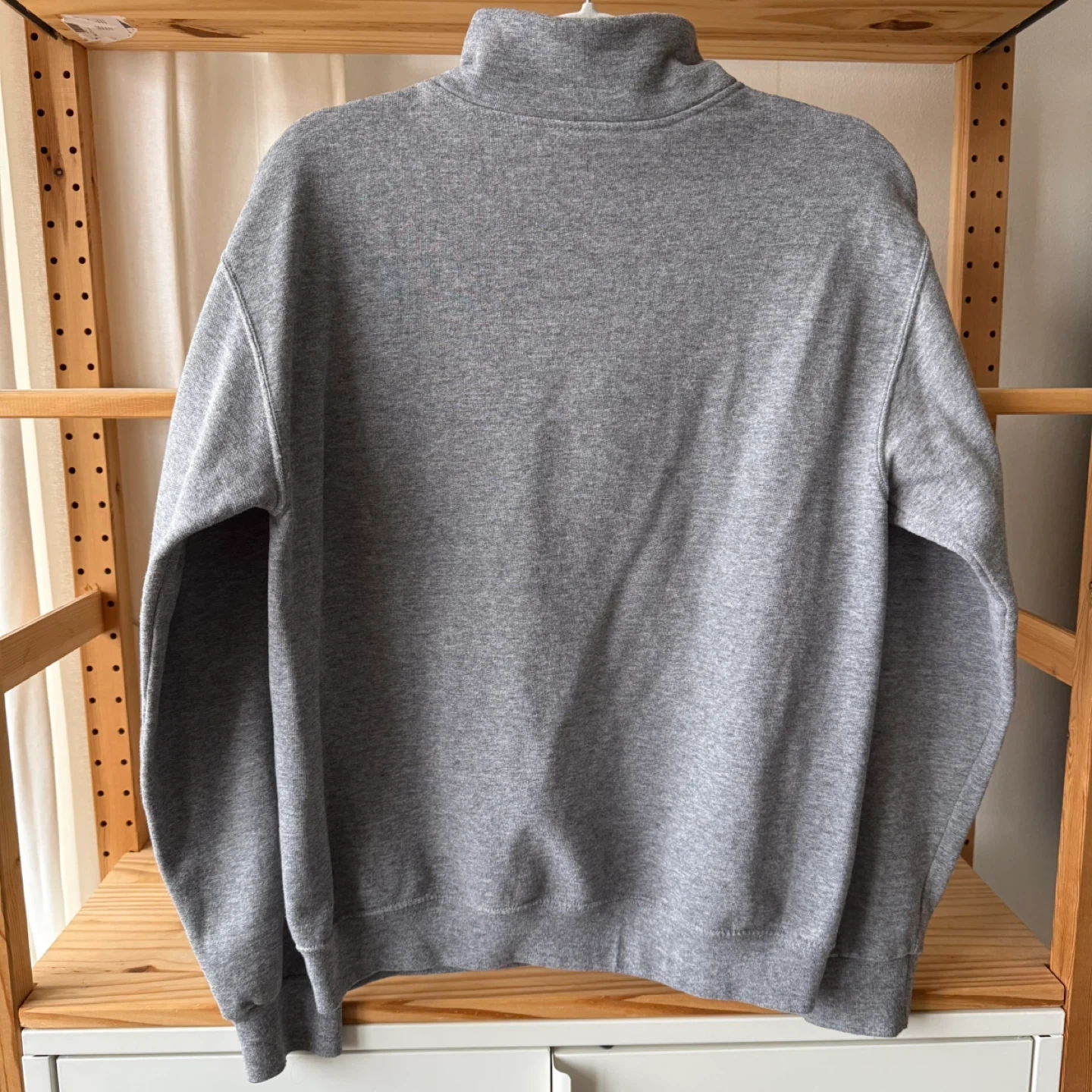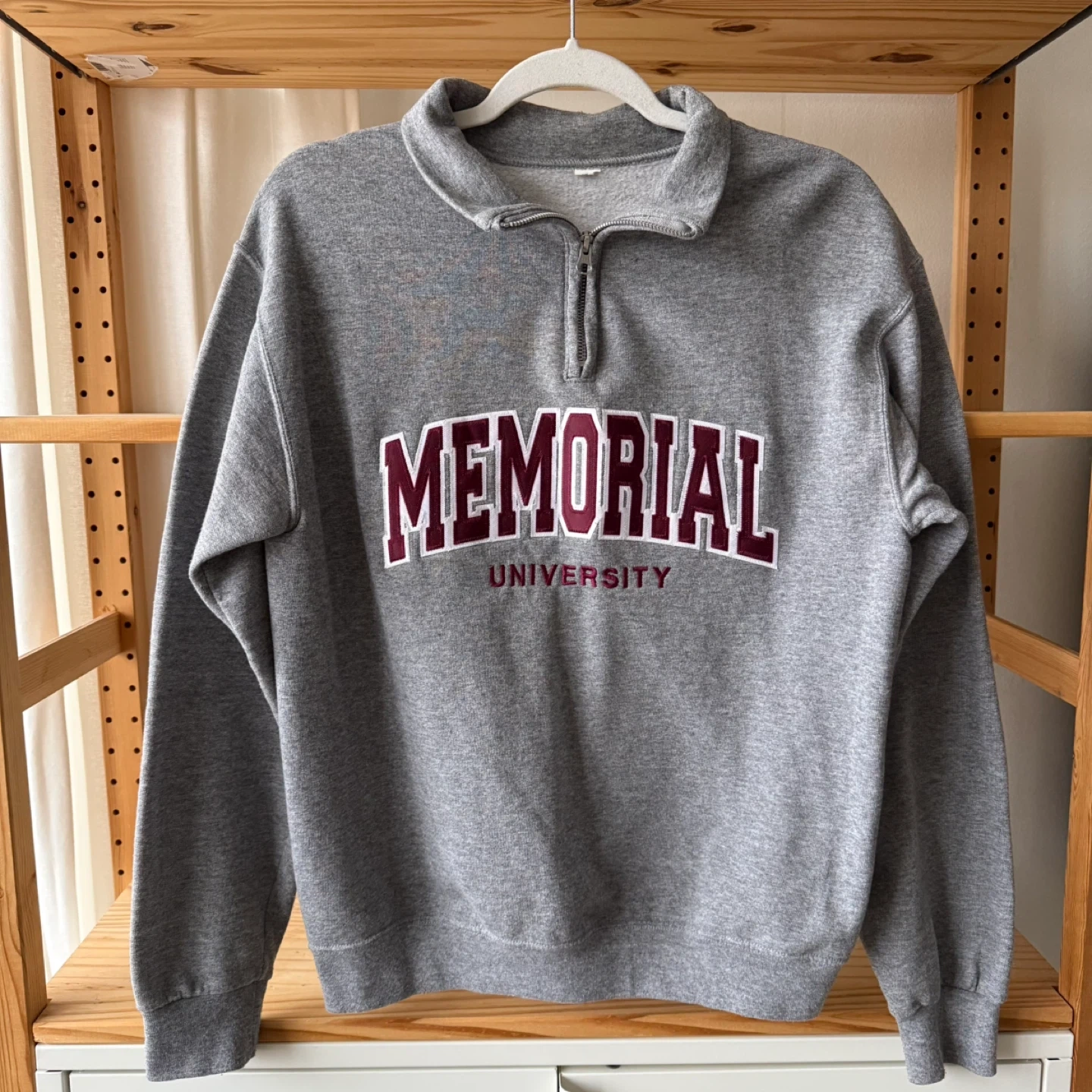 Grey quarter zip memorial university sweater. Cute sweater for a collegiate vibe even if you didn’t go there.