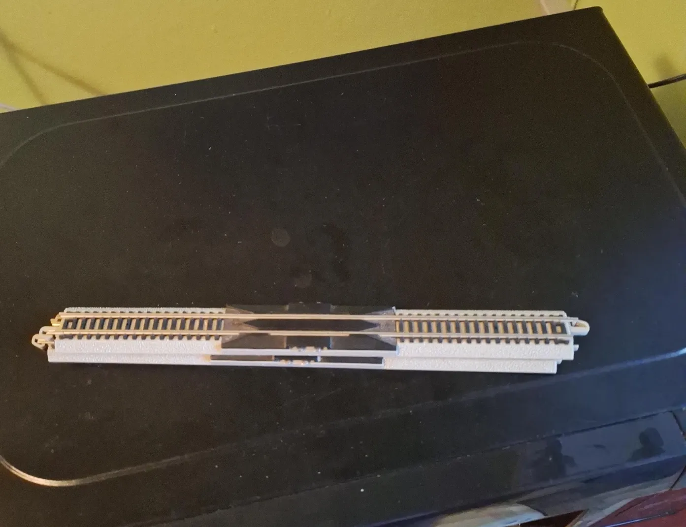 This is a double 10 inch straight N Scale uncoupler rails section of model train track. It appears to be a straight piece designed for connecting other track sections. The track is made of metal rails with plastic ties and a grey plastic roadbed.