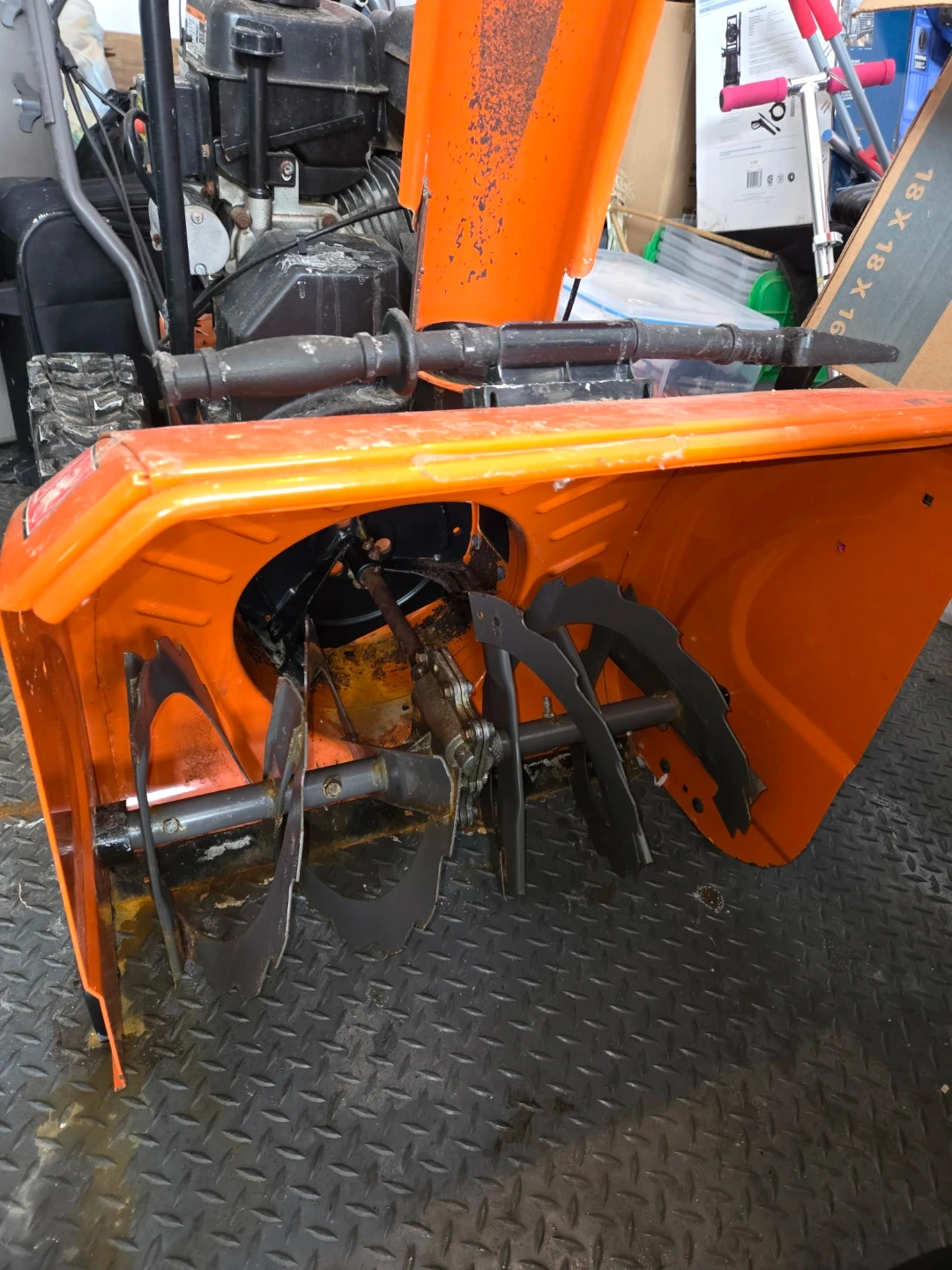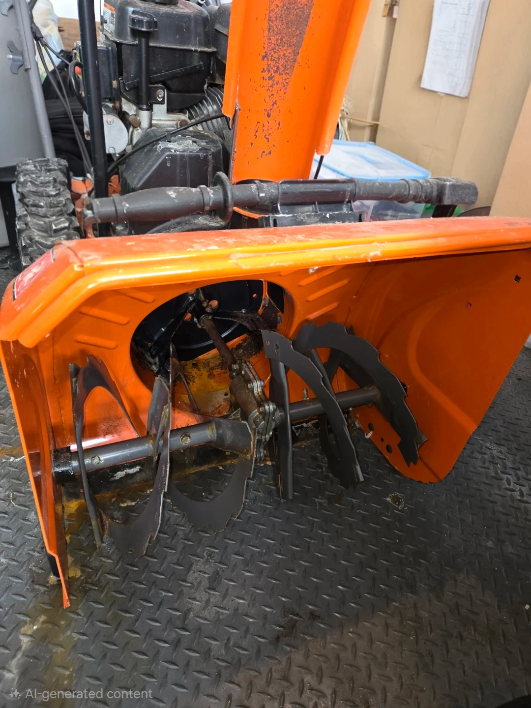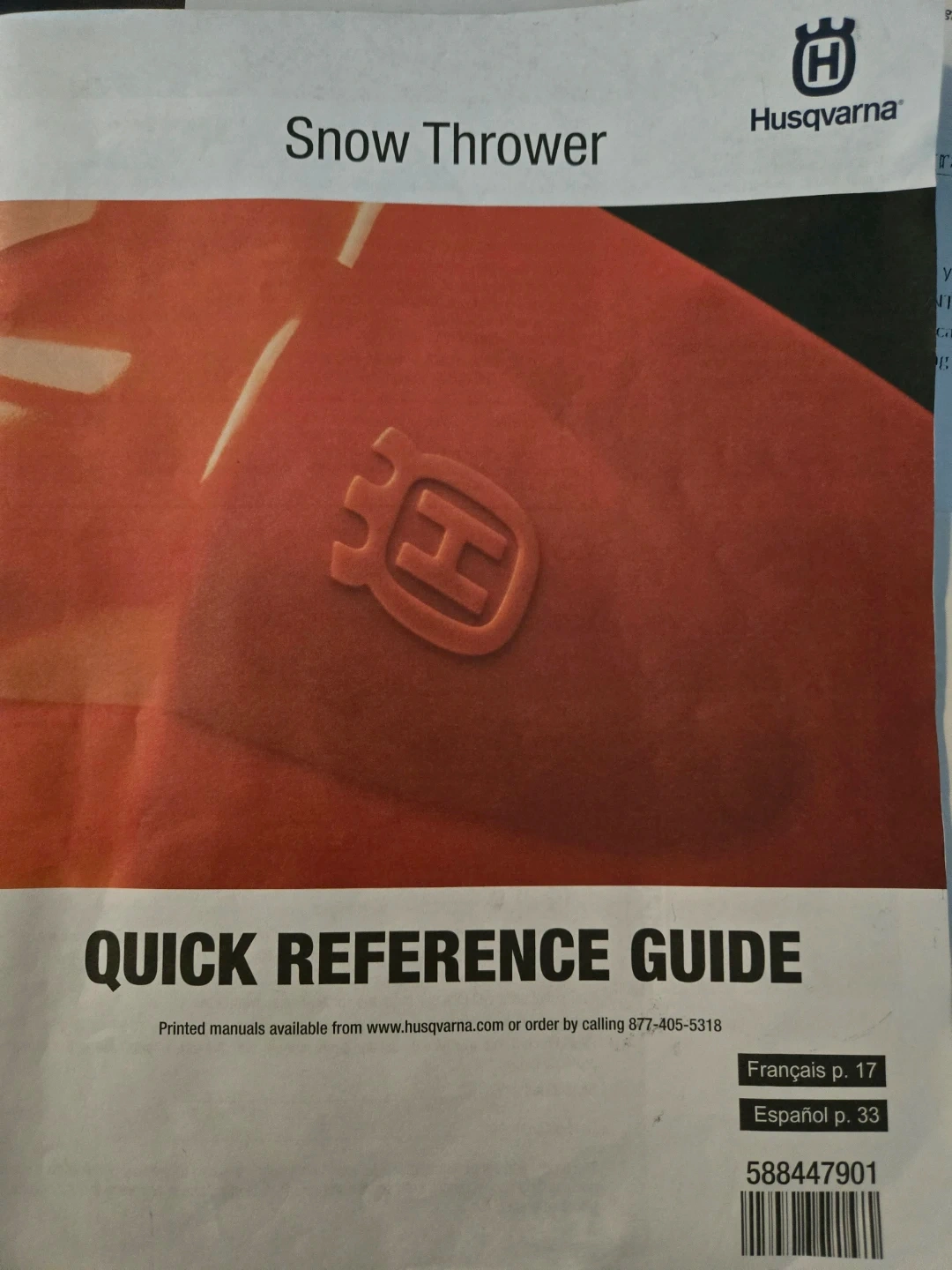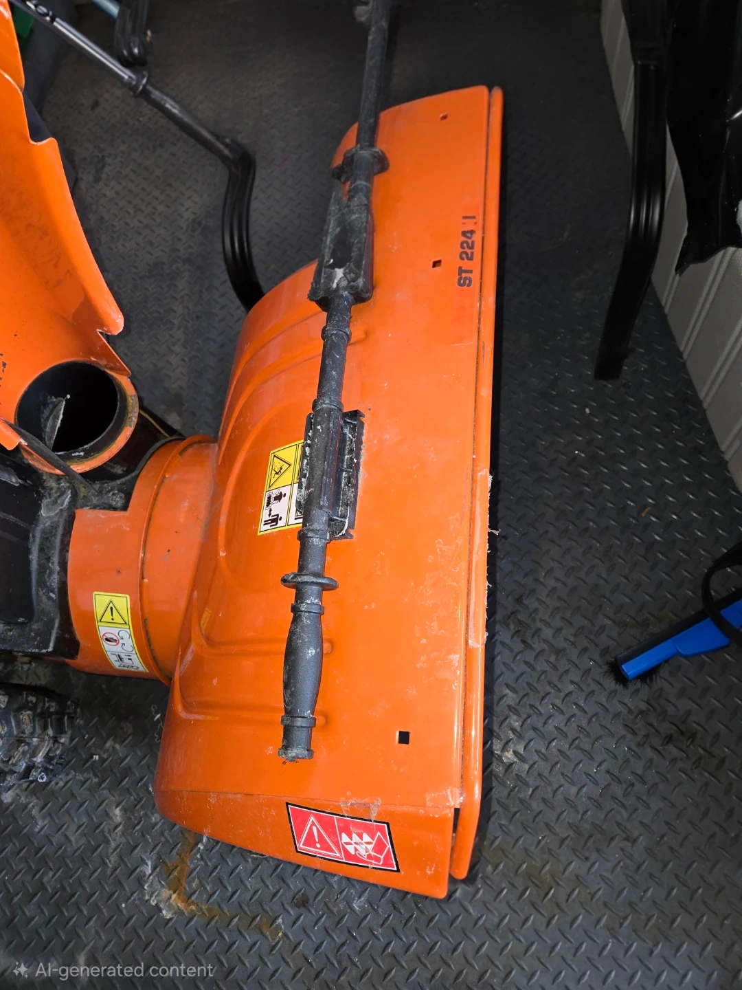 This is a used orange Husqvarna snow thrower, model ST 224. It features a gas-powered engine and large wheels for maneuverability. Perfect for clearing driveways and sidewalks after a snowfall! Bright lights and handle warmers for night time snowing clearing. Does not "blow" snow, it "throws" snow for neater snow clearing than snow blowers. Working condition. Used only once this year due to hired snow removers. No longer needing such a large, heavy duty machine to clean the edges after the plowers come.