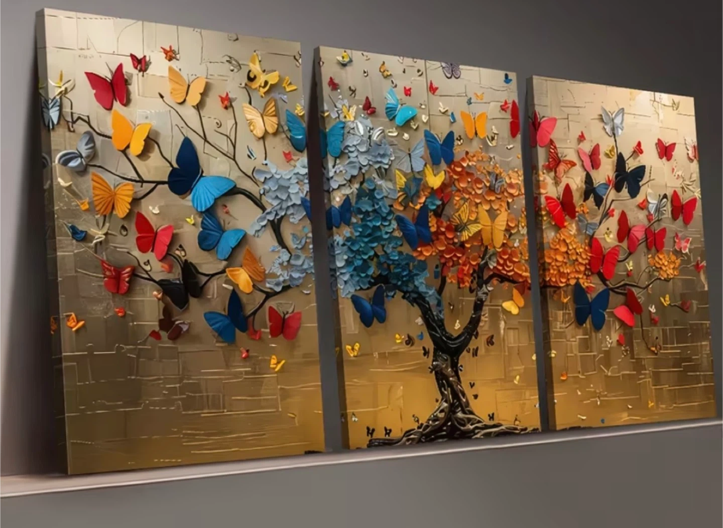 This is a striking 3-piece wall art set featuring a 3D butterfly tree design. The artwork has a textured gold background with vibrant butterflies in shades of red, orange, yellow, and blue. It's a beautiful statement piece for any room!