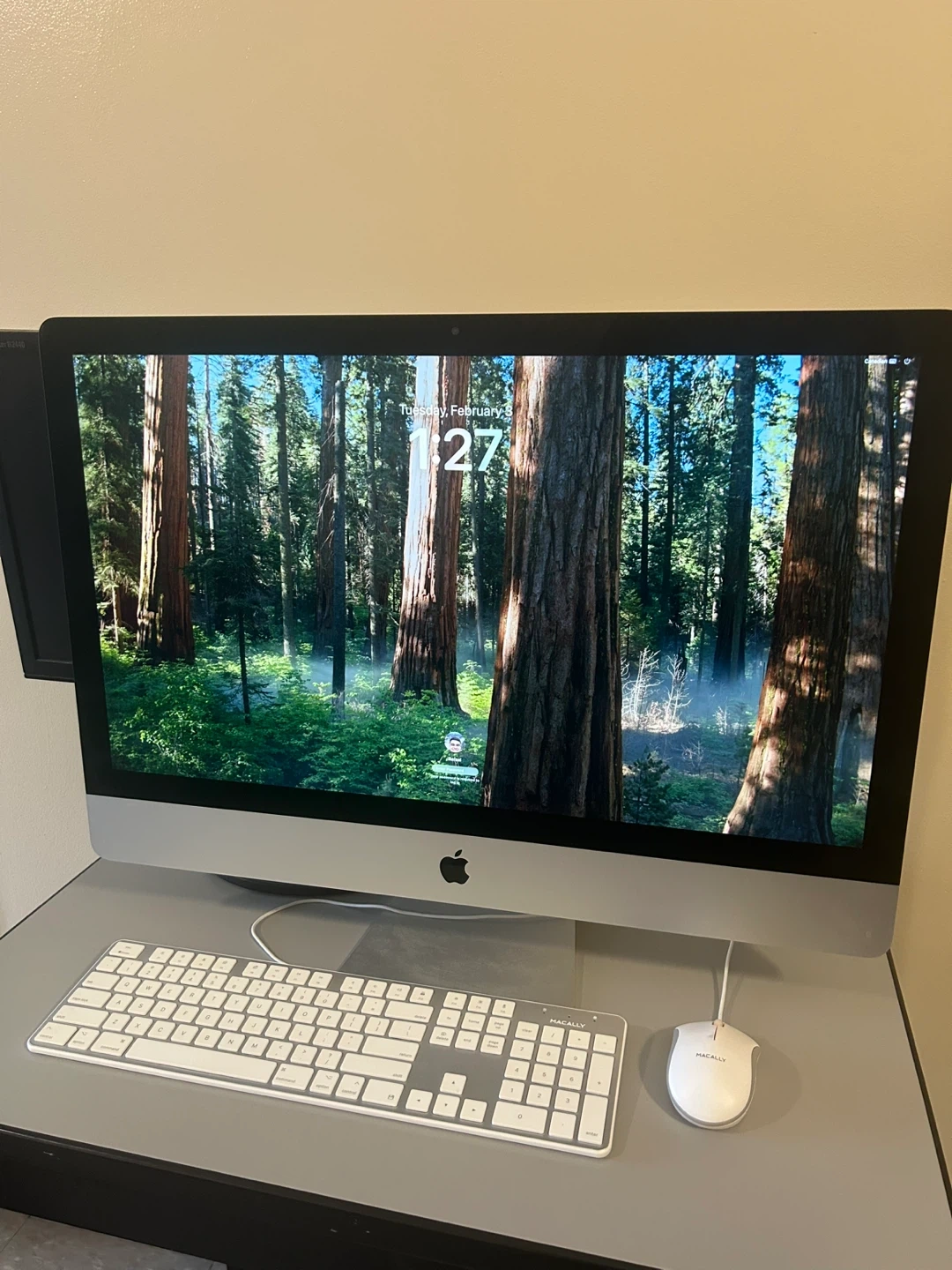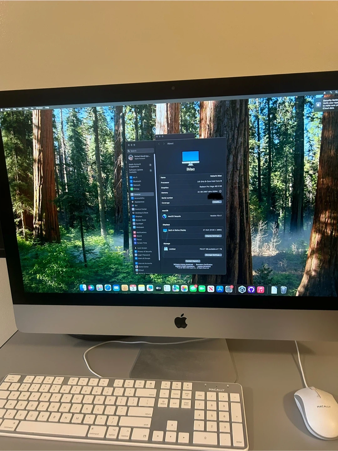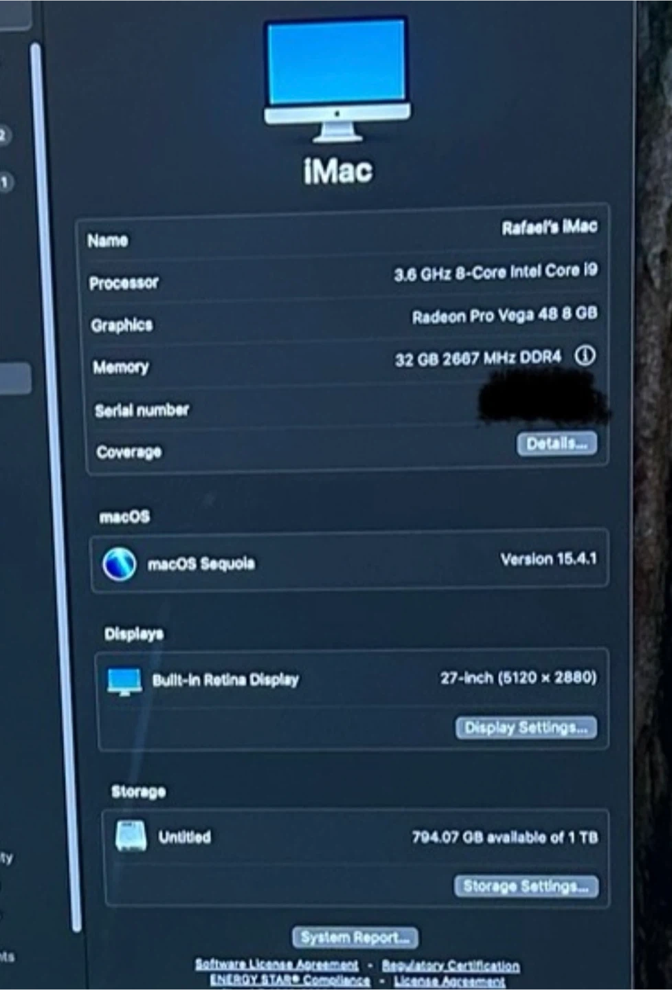 This iMac has a 27-inch Retina Display with a 5120 x 2880 resolution. It's powered by a 3.6 GHz 8-Core Intel Core i9 processor and 32 GB of 2667 MHz DDR4 memory. Storage is a 1 TB drive. It runs macOS Sequoia version 15.4.1.
