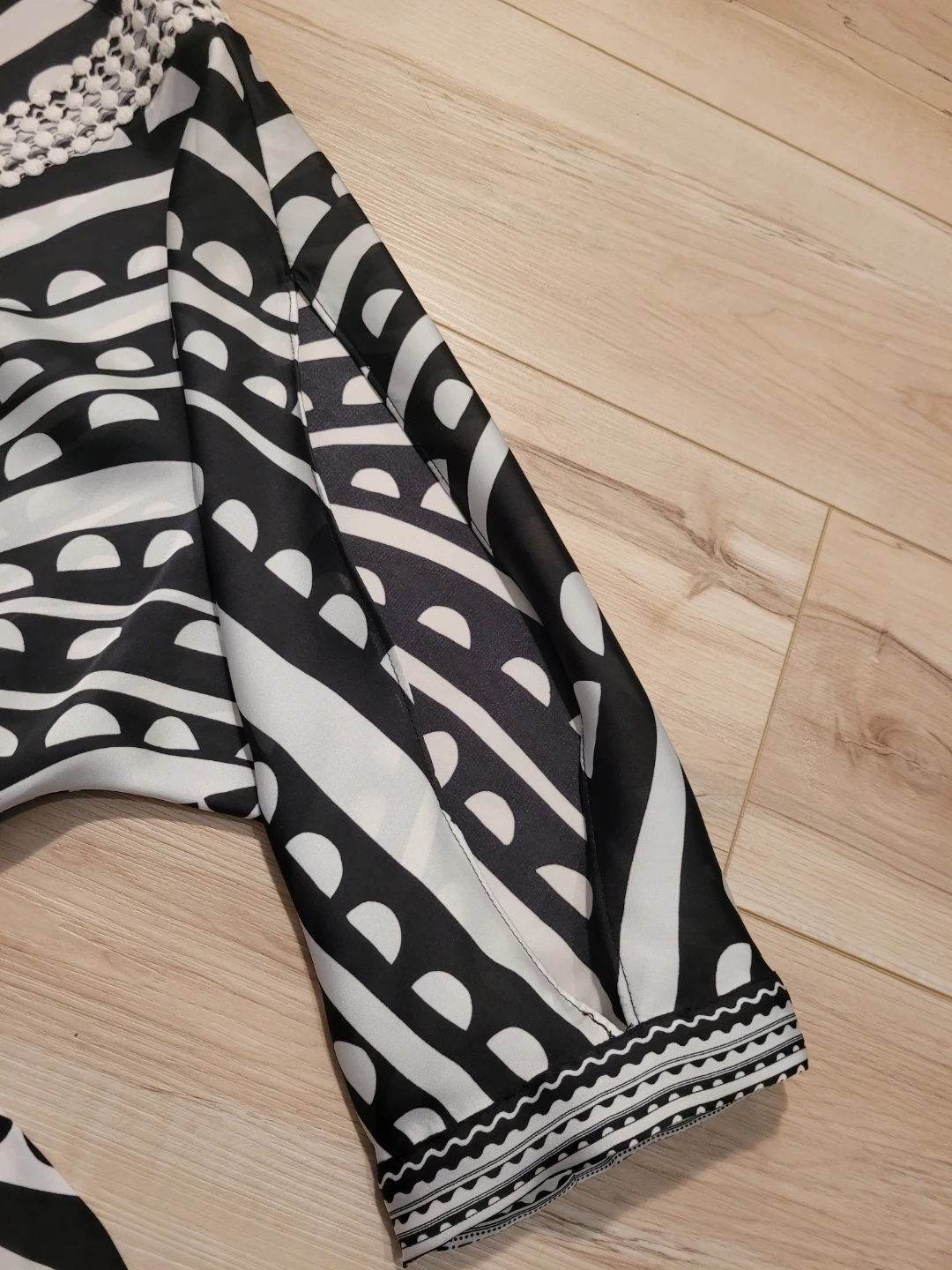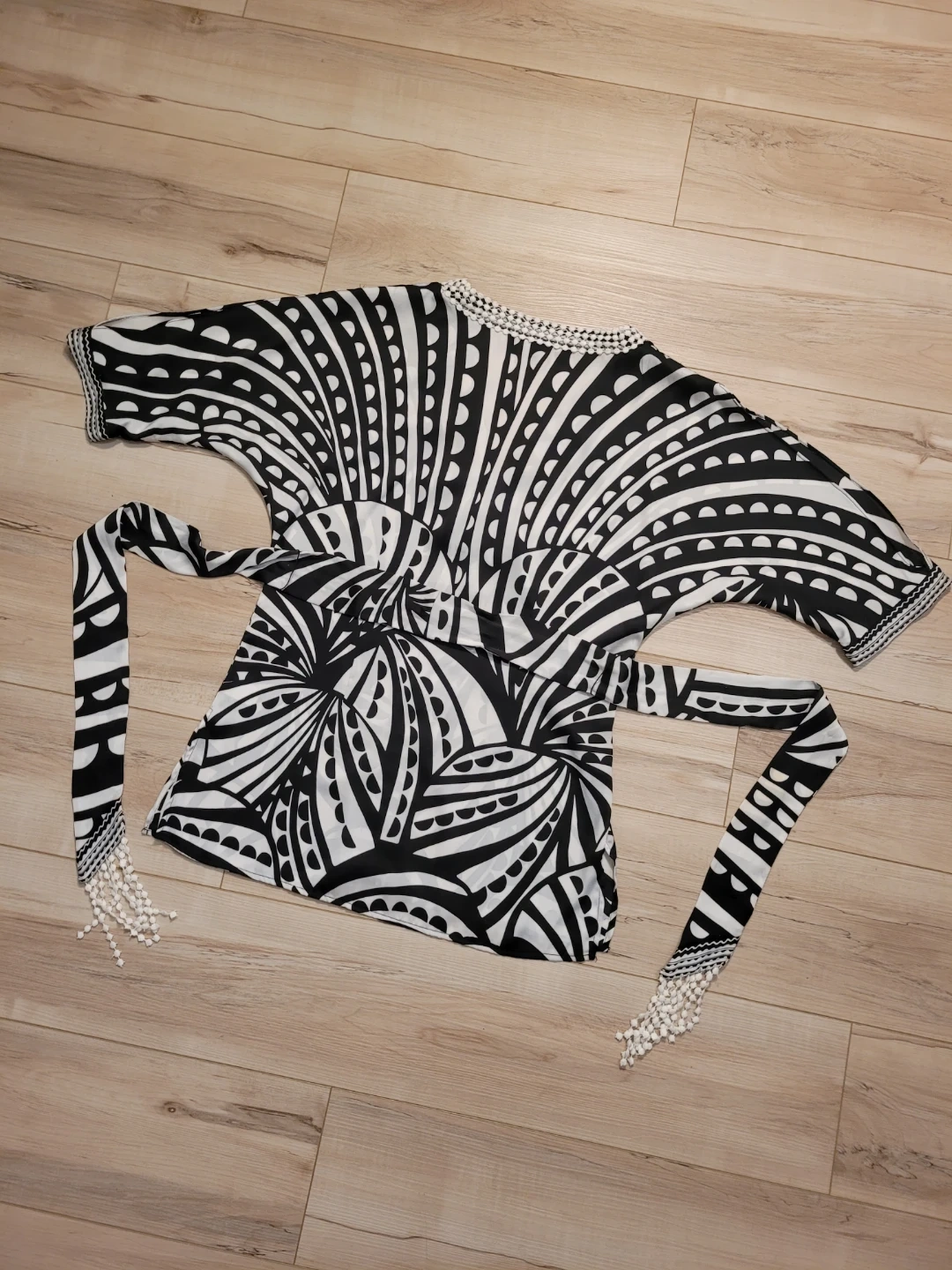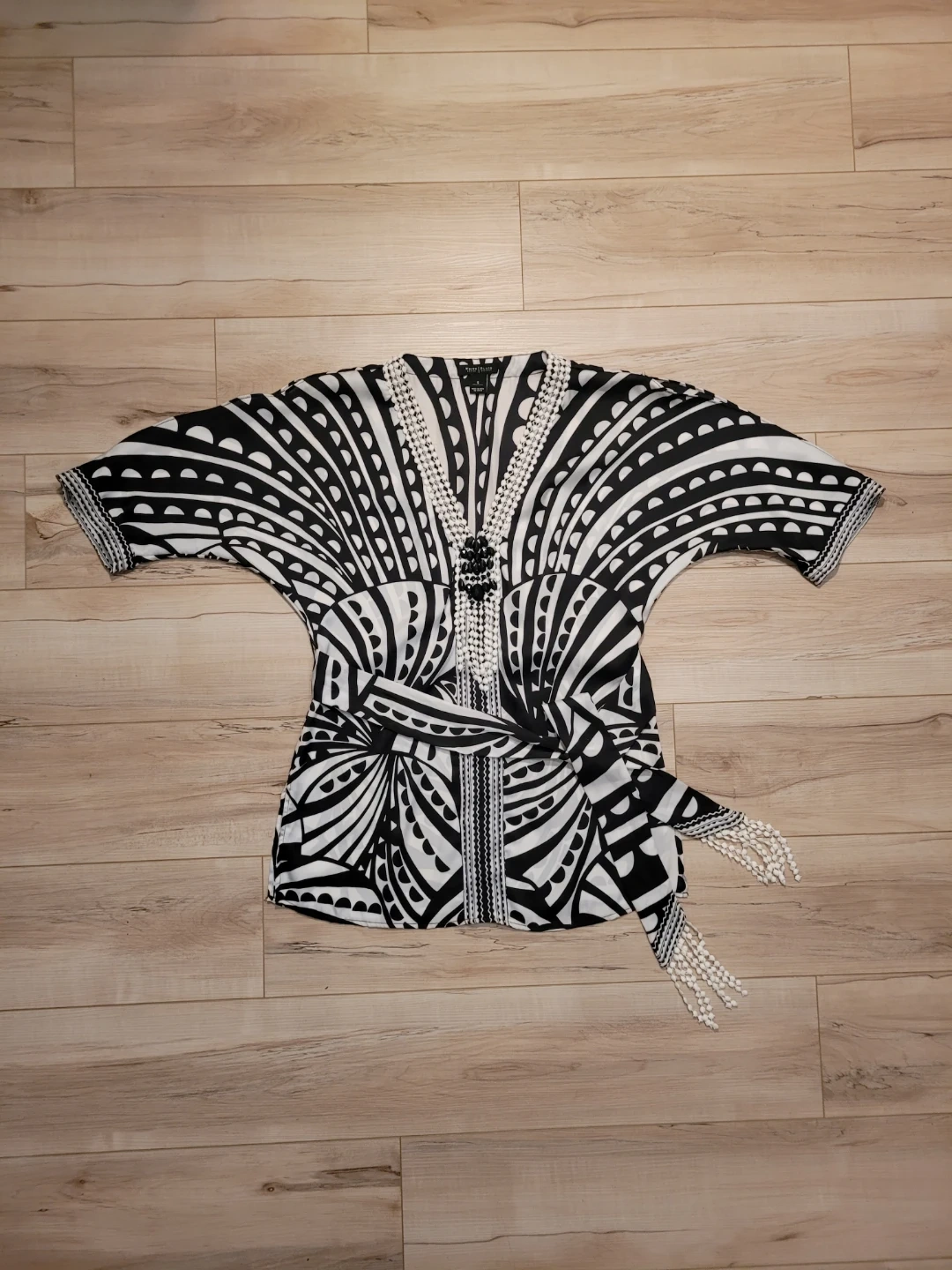 This flowing kimono-style tunic. Striking black and white patterns across the fabric, while the intricate embellished neckline adds a touch of sophistication. Perfectly suited for embracing both casual moments and upscale gatherings, this piece makes a bold statement in any wardrobe. Great condition.
