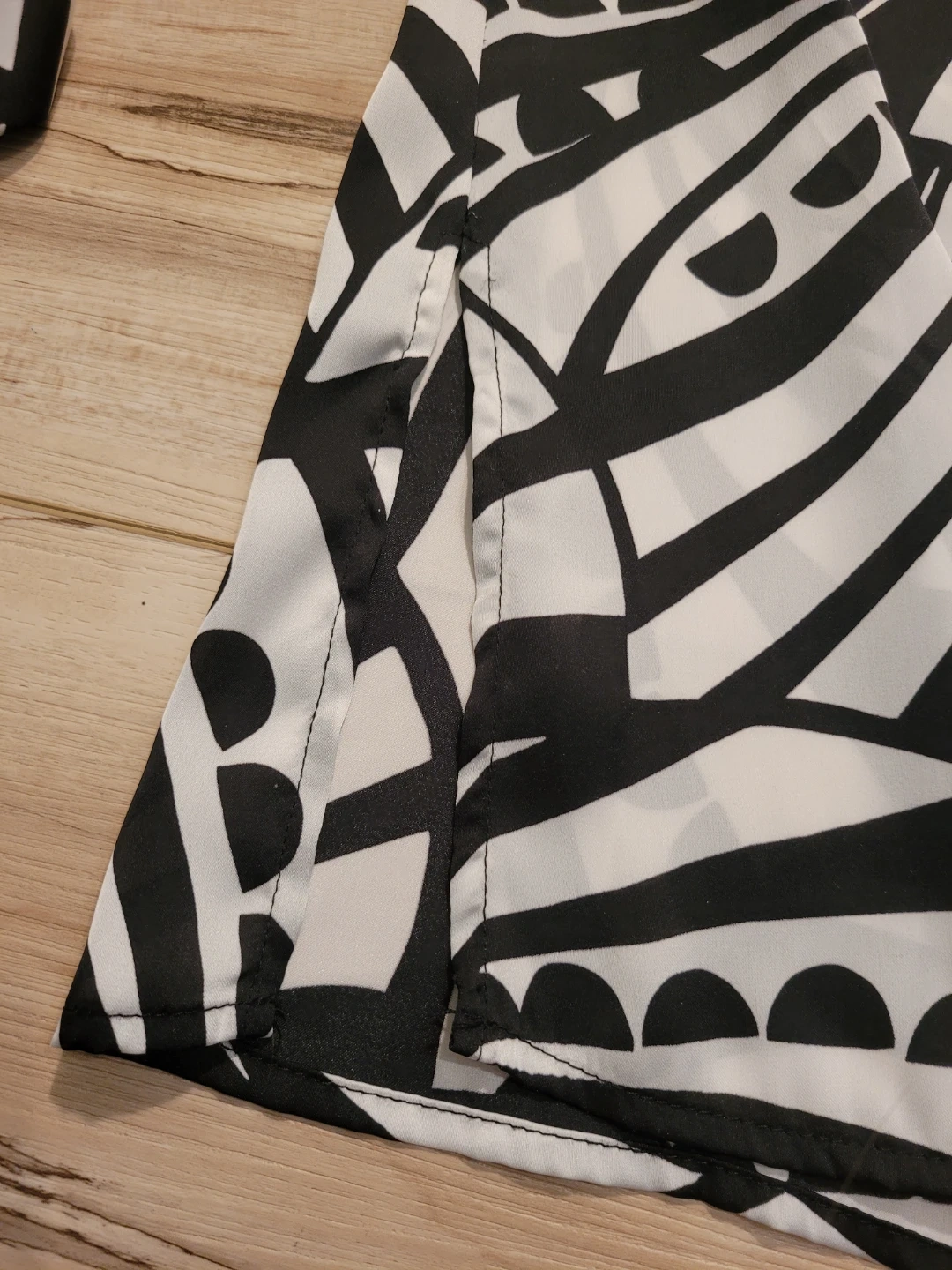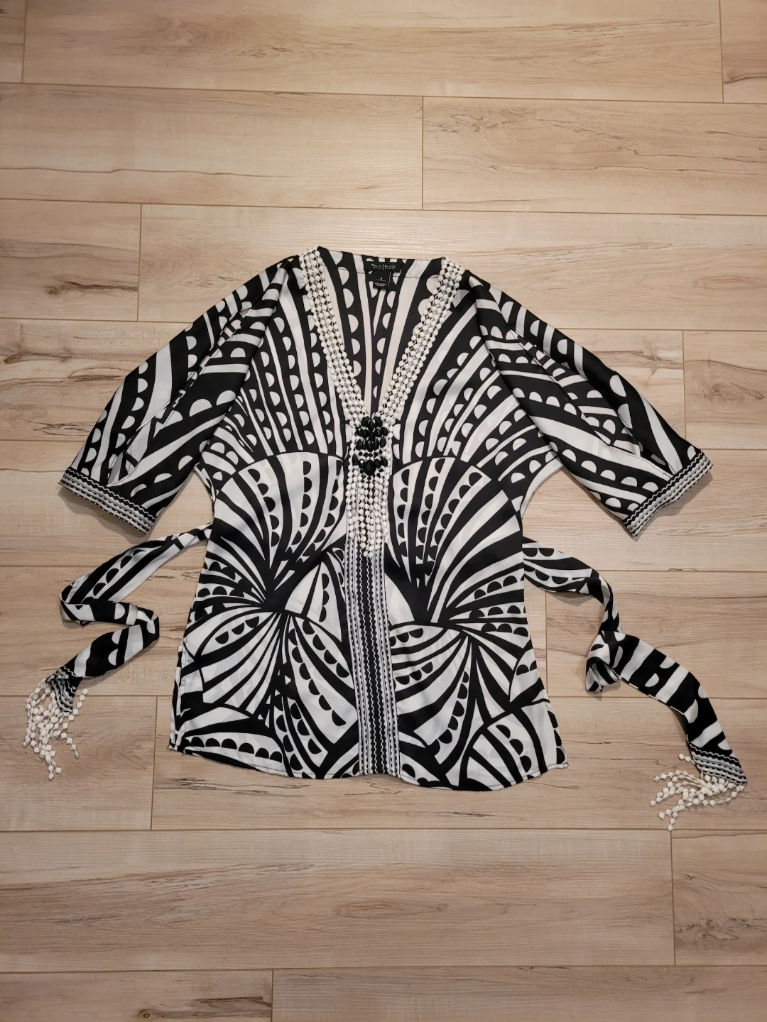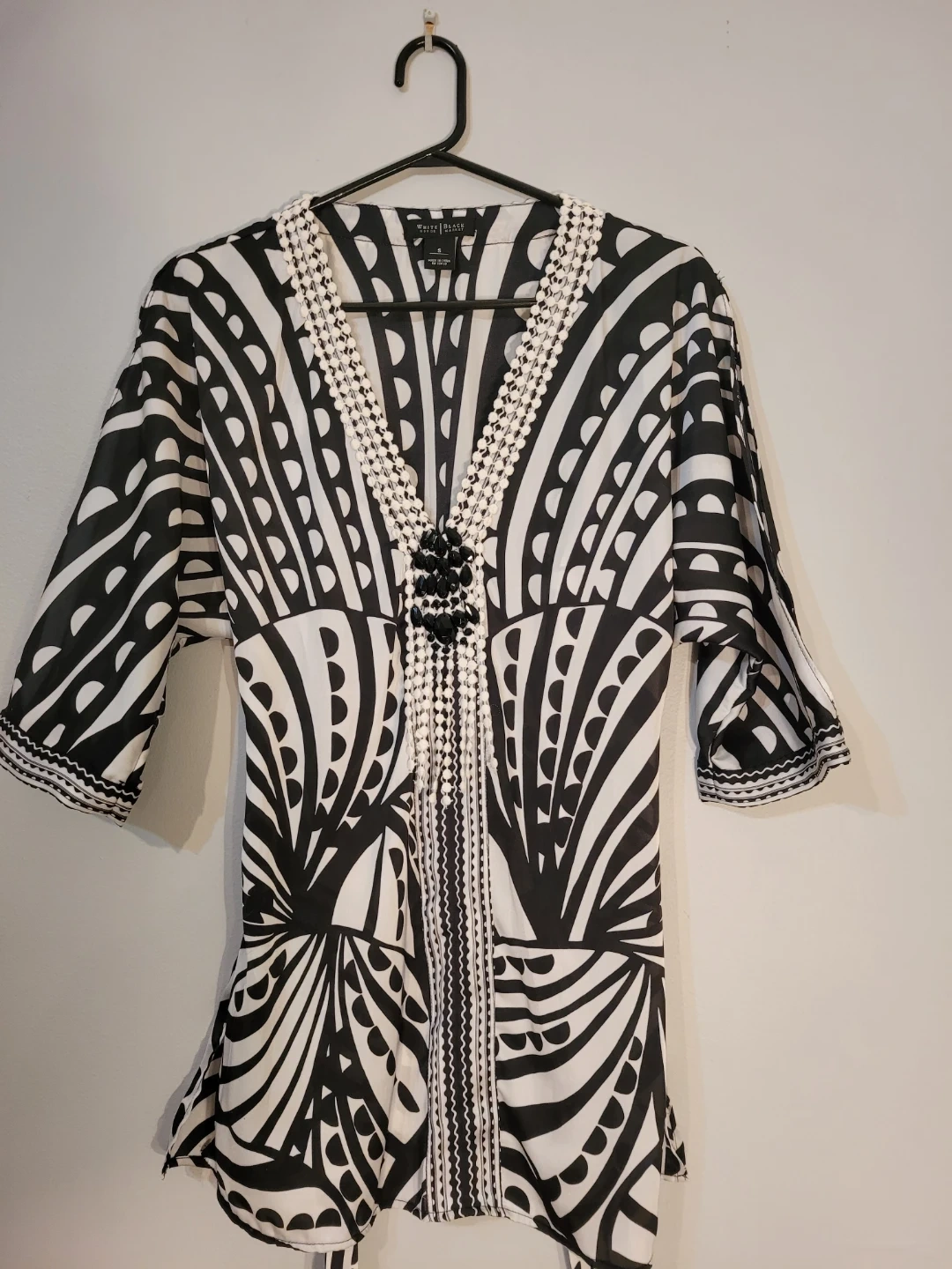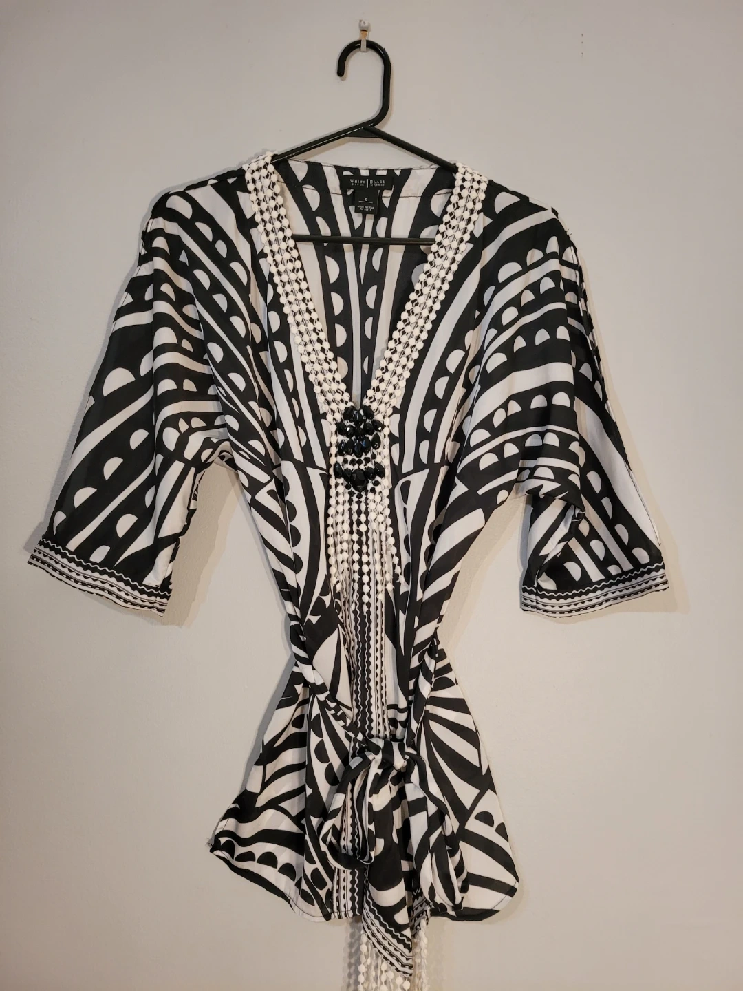 This flowing kimono-style tunic. Striking black and white patterns across the fabric, while the intricate embellished neckline adds a touch of sophistication. Perfectly suited for embracing both casual moments and upscale gatherings, this piece makes a bold statement in any wardrobe. Great condition.