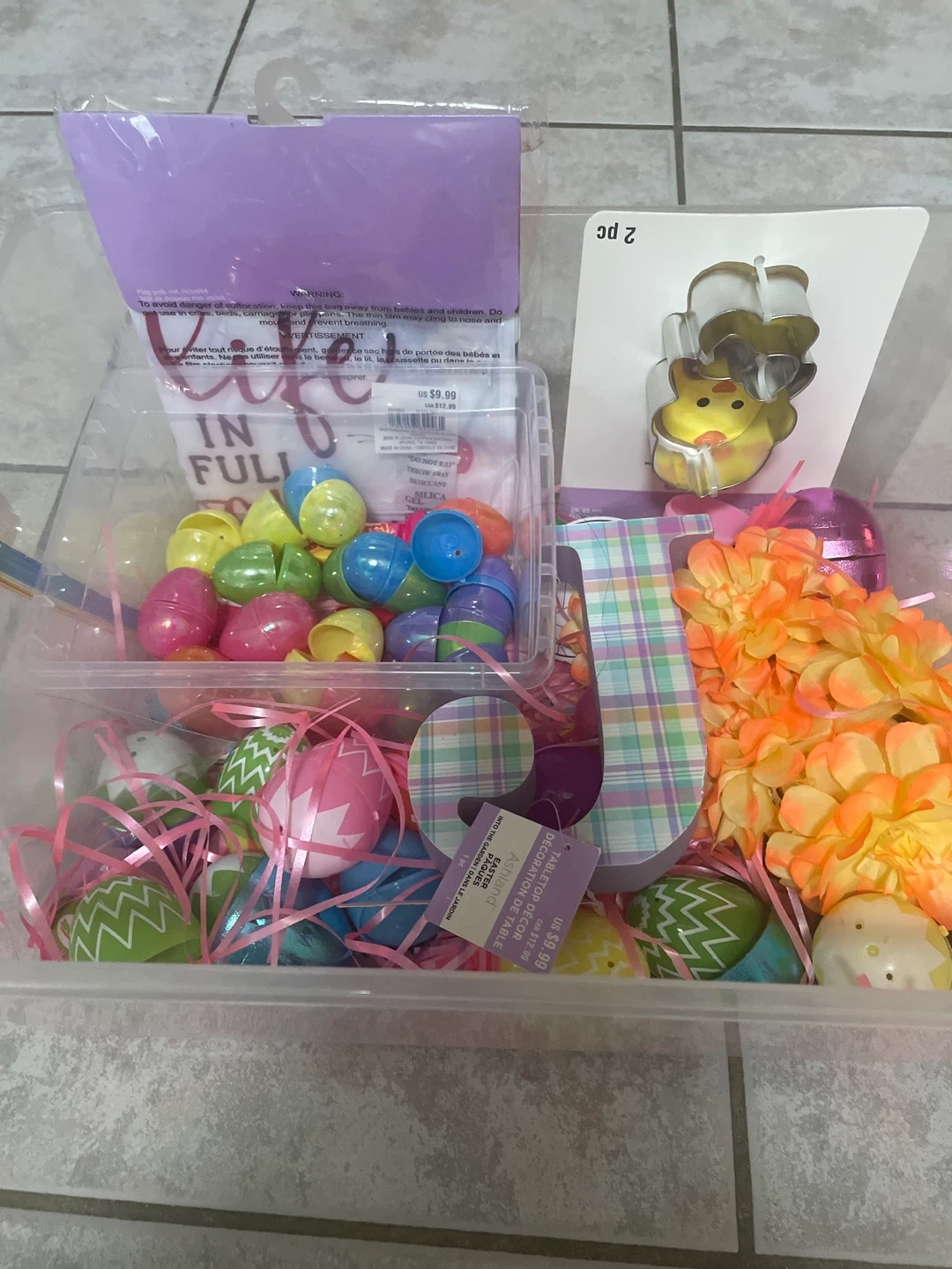 Assorted Easter decorations including plastic eggs, decorative flowers, a chick cookie cutter, and a letter 'J'. Includes a warning about suffocation hazard for the plastic bags. This set is great for Easter egg hunts and table decorations.