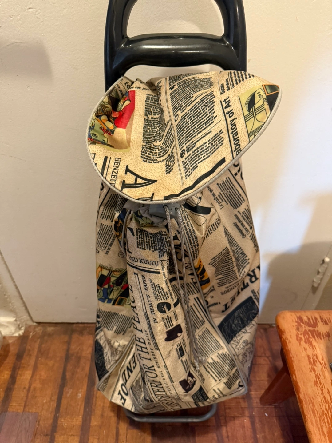 This shopping trolley bag features a unique newspaper print design! It's perfect for carrying groceries or other items while you're out and about. The bag is in great condition and ready for a new home
