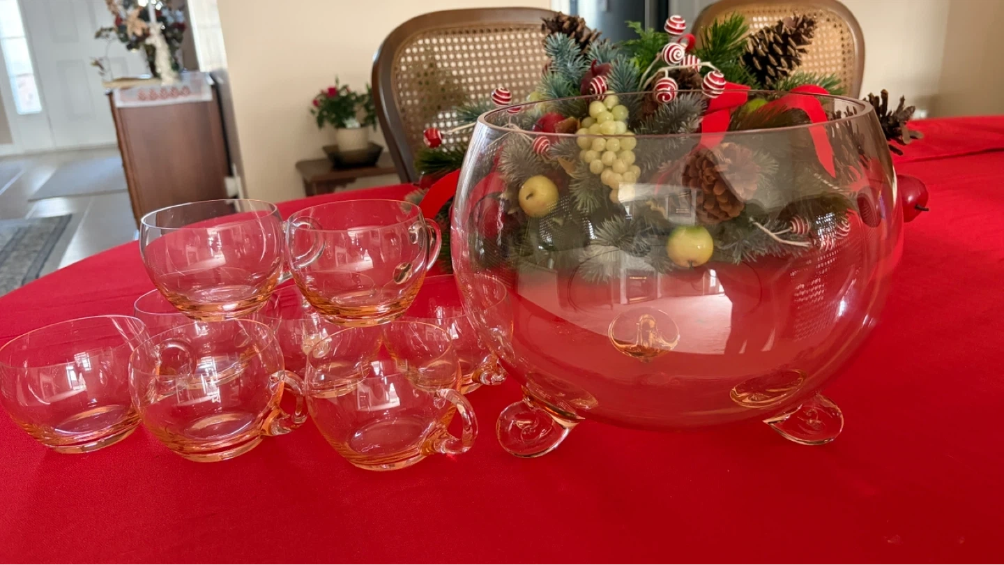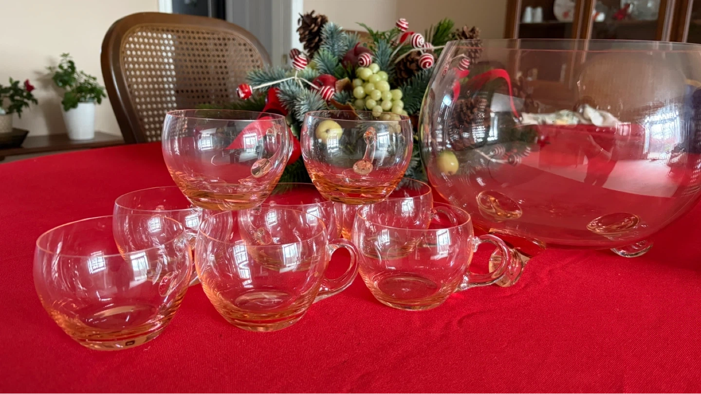 This set includes a large pink glass punch bowl with a unique footed design and ten matching glass cups. It's perfect for serving beverages at parties and gatherings!