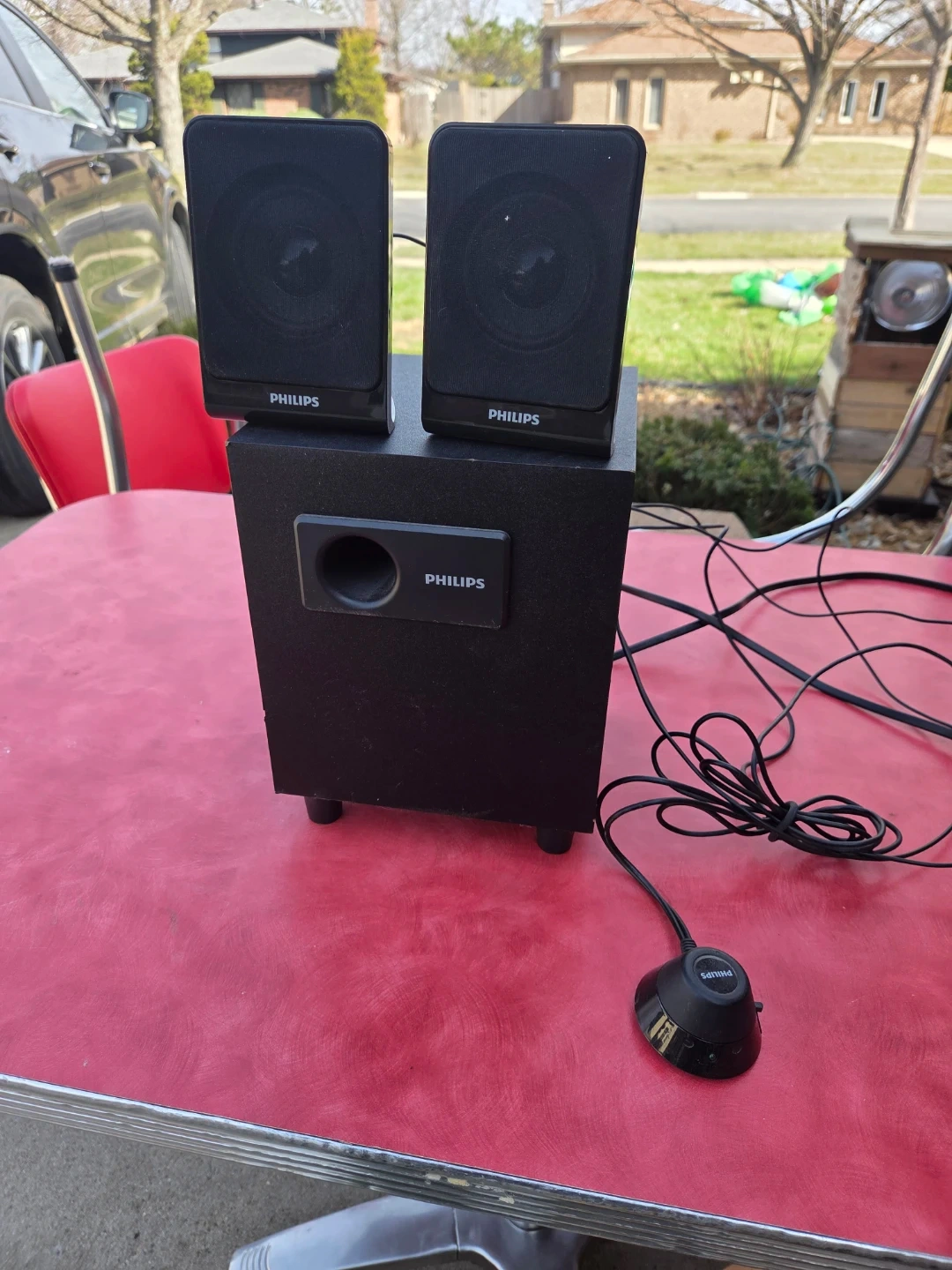 This is a Philips 2.1 speaker system with a subwoofer and two satellite speakers for Bookshelf, Desktop or Laptop computer. They're small but their audio is excellent. Sound output is an ⅛" audio jack that plugs directly into your computer or other audio device (i.e., iPod, etc.) and has independent volume control. Powered by a regular wall plug🔌and not a plug & play unit.