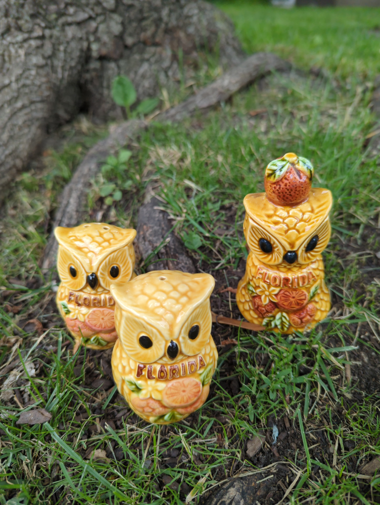 Mint condition vintage owl ceramic set of salt & pepper shakers plus a dinner bell. Souvenir set that says "Florida" on the front.