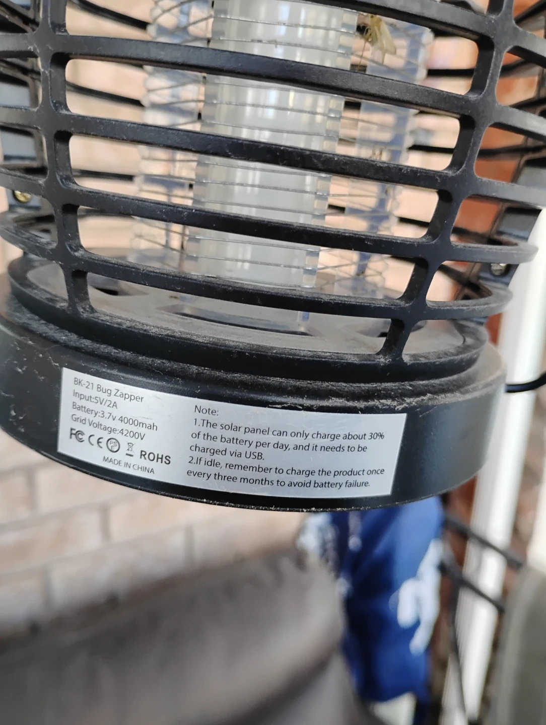 This BK-21 bug zapper lamp uses a solar panel or USB to charge its 4000mAh battery. It's designed to attract and eliminate flying insects. The unit has multiple settings for light and bug zapping modes. It can be hung using the included wire frame.