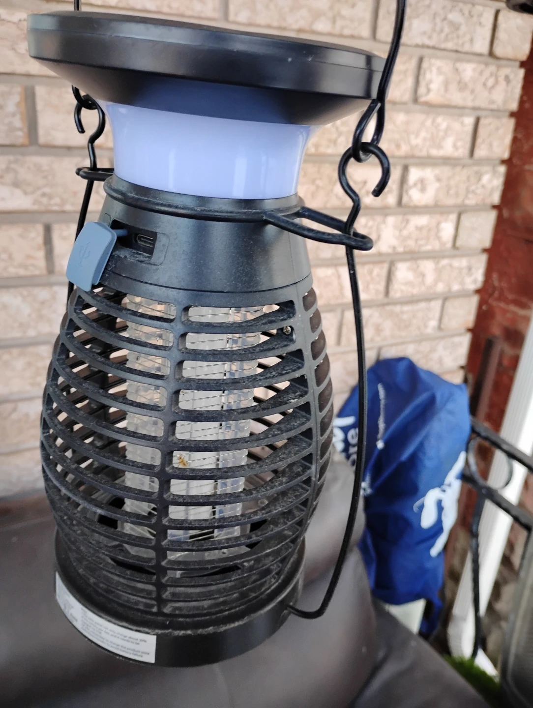 This BK-21 bug zapper lamp uses a solar panel or USB to charge its 4000mAh battery. It's designed to attract and eliminate flying insects. The unit has multiple settings for light and bug zapping modes. It can be hung using the included wire frame.