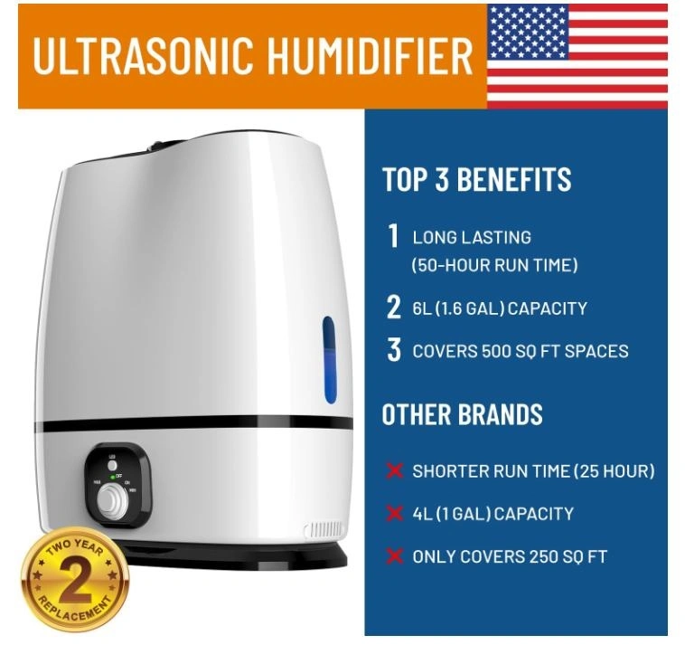 Everlasting Comfort 6L Ultrasonic Cool Mist Humidifier for Bedroom - Quiet, Filterless, Essential Oil Tray - Large Room, Baby, Kids, Nursery - 50-Hour Runtime.