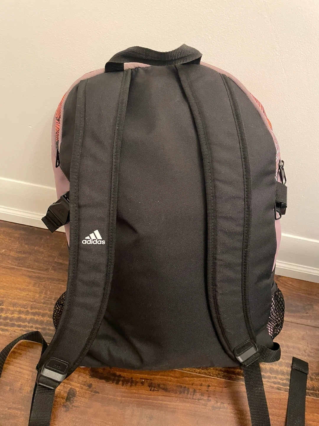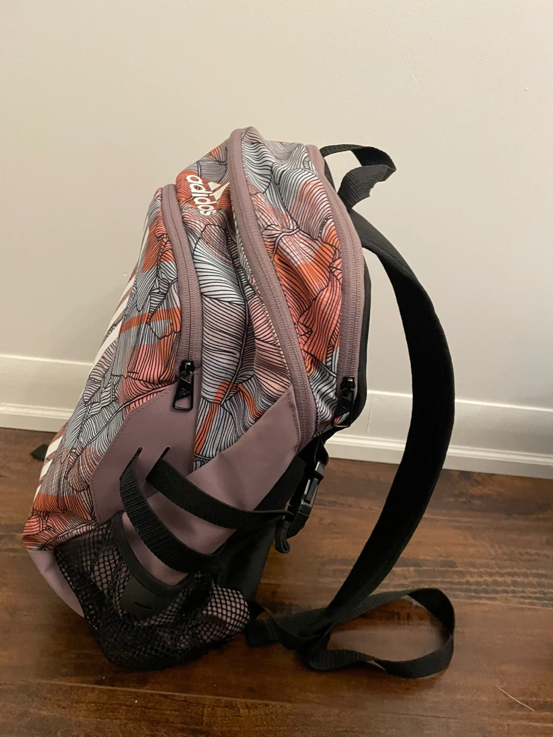 It has 3 zippers plus a small one (in second picture). With two spaces on side for water bottle. It's in great condition. Perfect for school or everyday use!