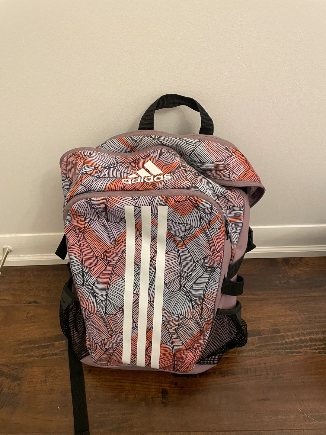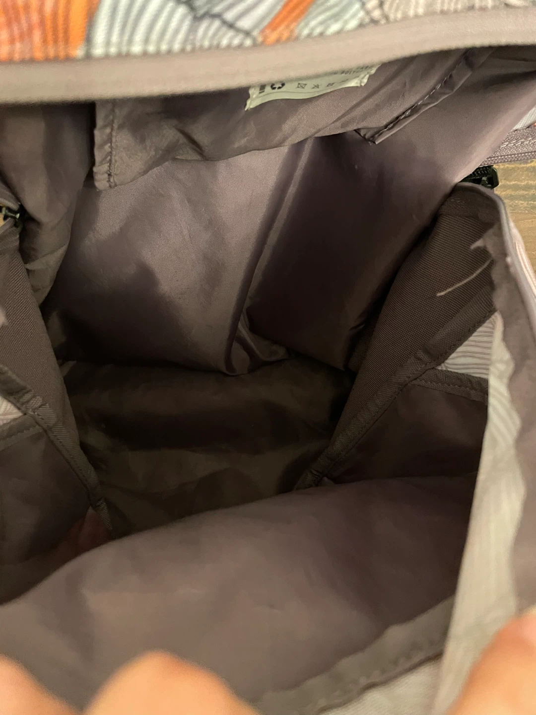 It has 3 zippers plus a small one (in second picture). With two spaces on side for water bottle. It's in great condition. Perfect for school or everyday use!