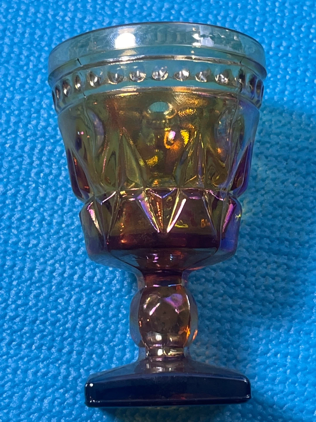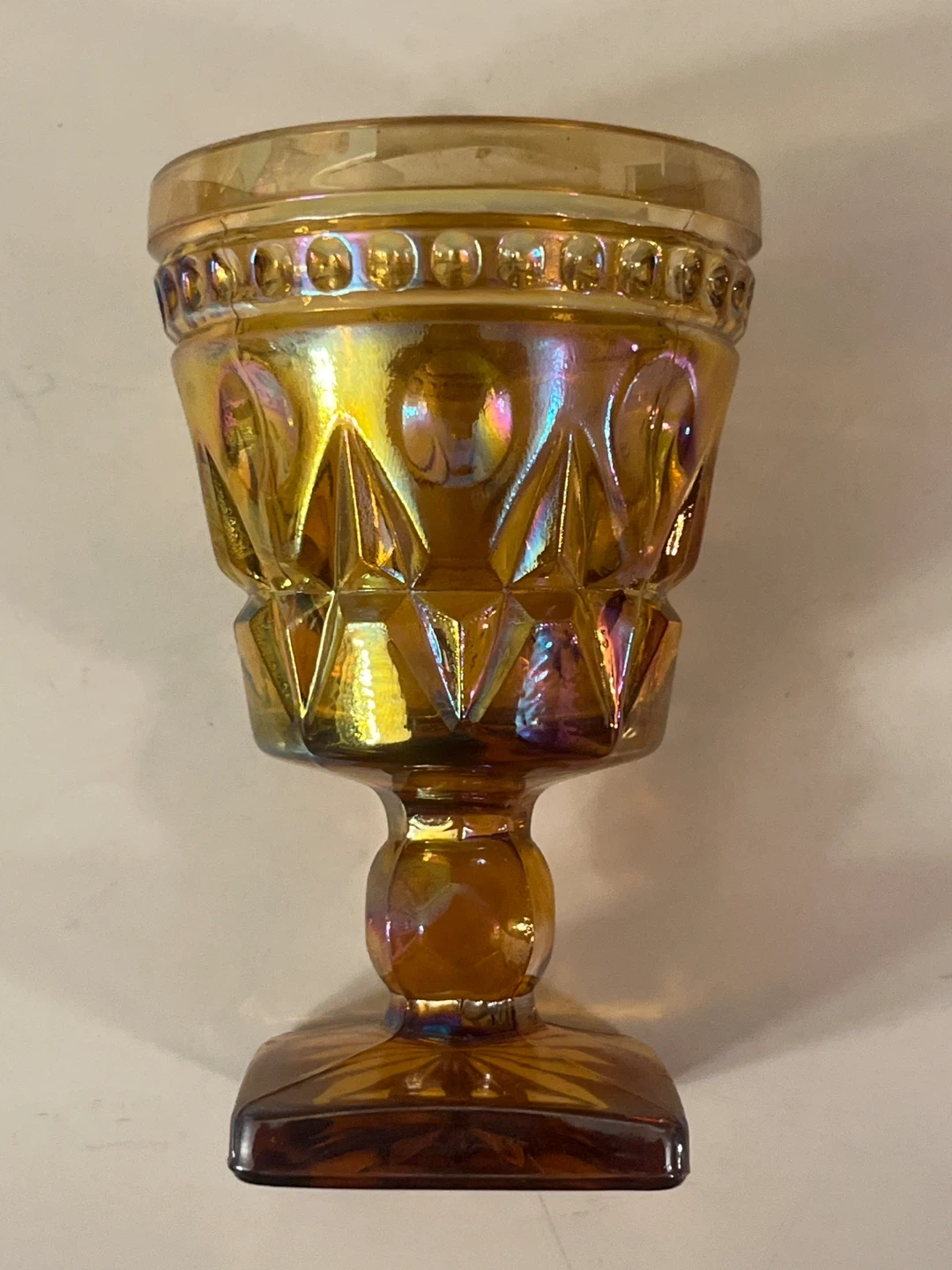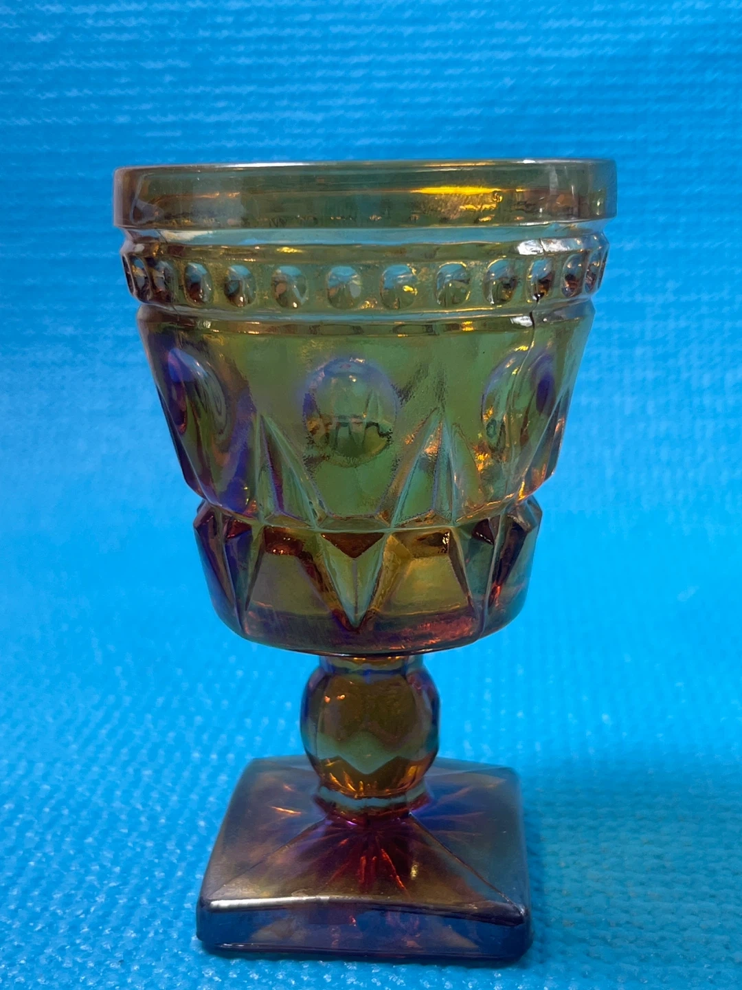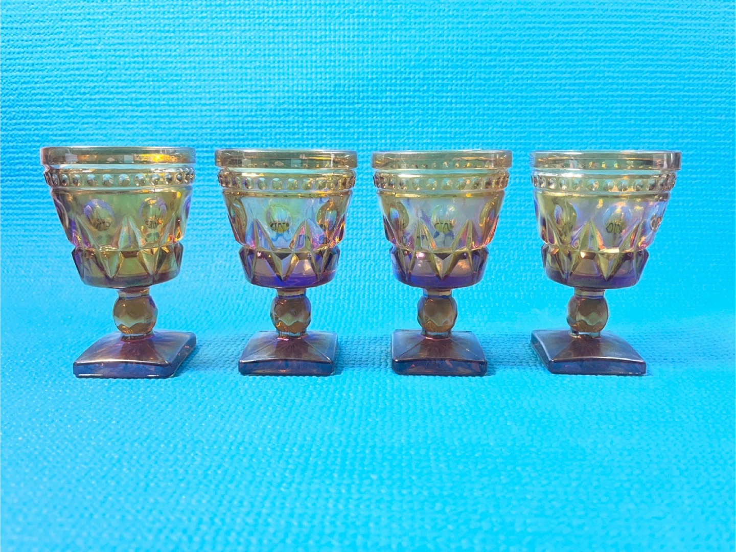 Stunning set of 4 vintage Indiana Glass "Colony Park Lane" goblets in a beautiful iridescent marigold (amber) finish. These pieces feature a classic mid-century geometric pattern and a unique square pedestal base.