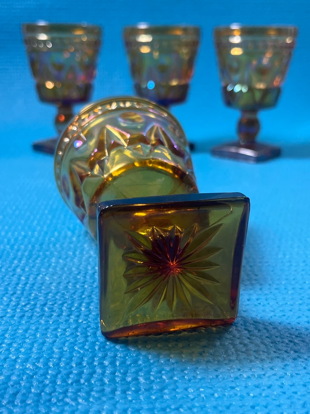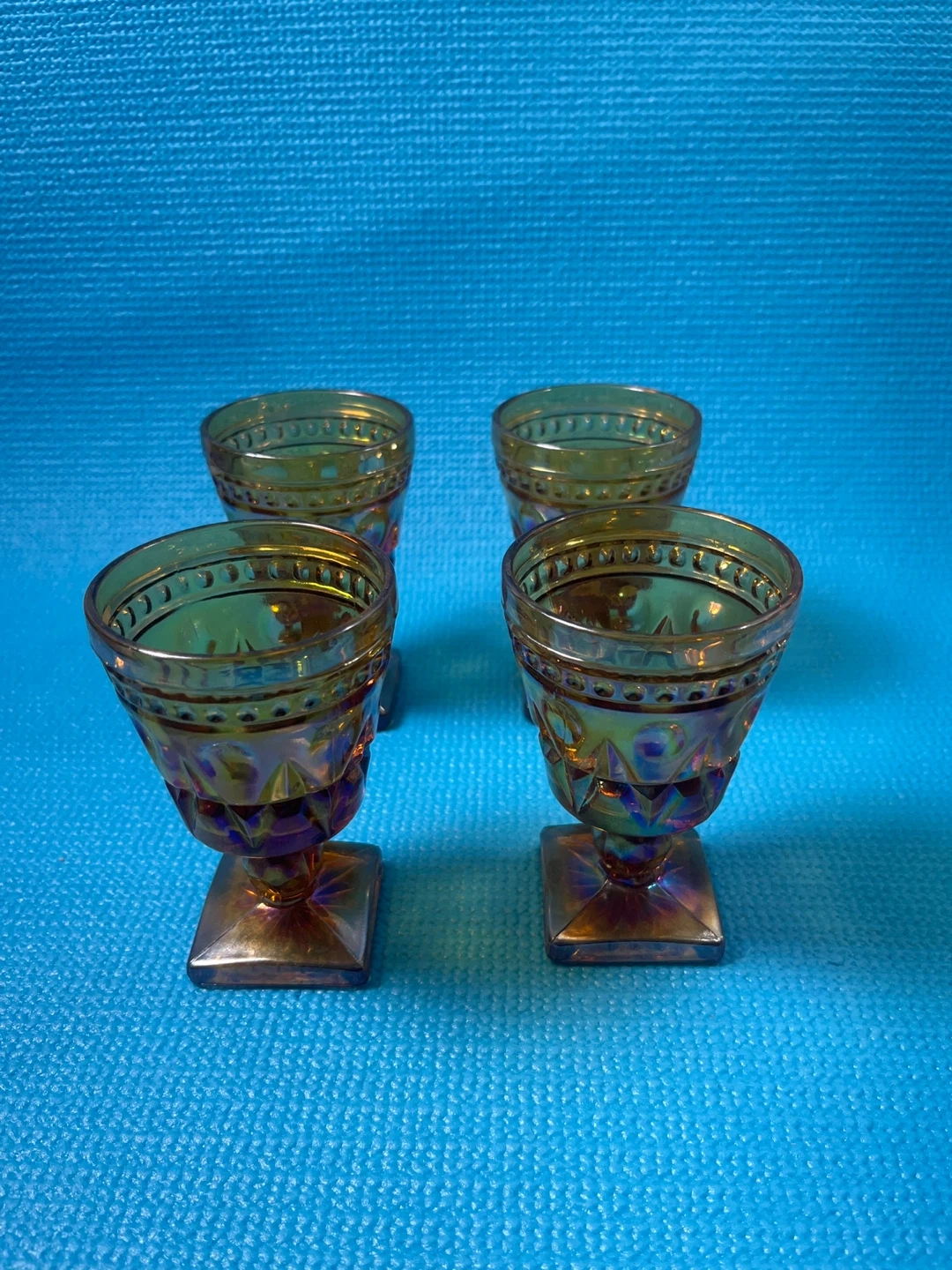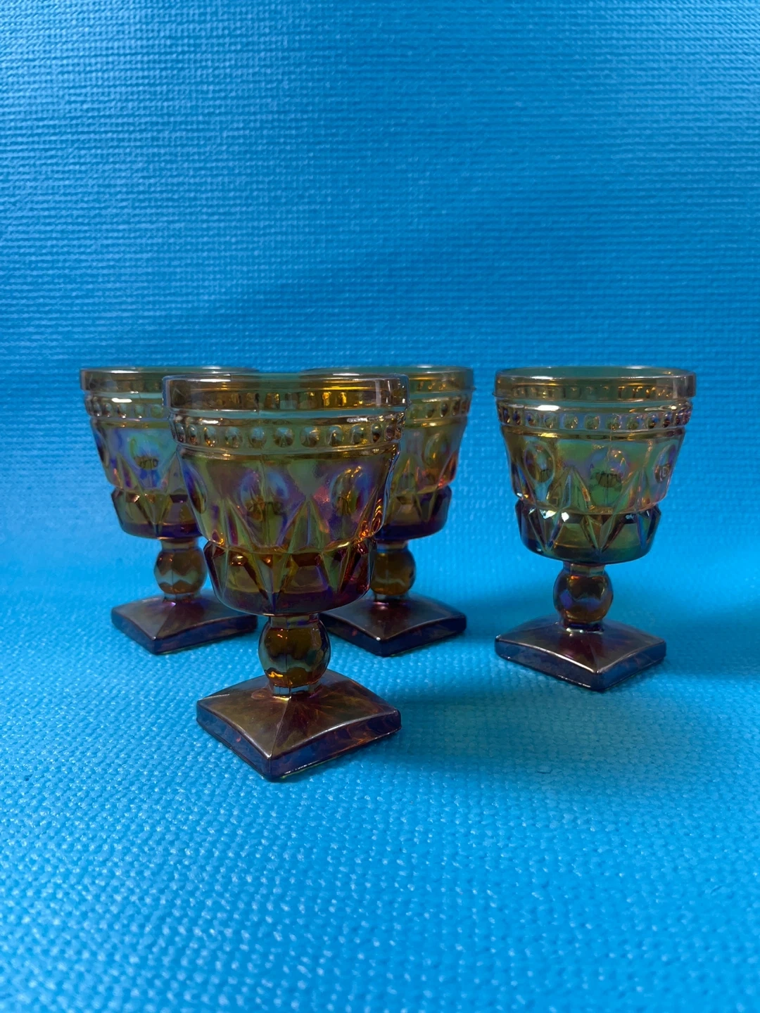 Stunning set of 4 vintage Indiana Glass "Colony Park Lane" goblets in a beautiful iridescent marigold (amber) finish. These pieces feature a classic mid-century geometric pattern and a unique square pedestal base.