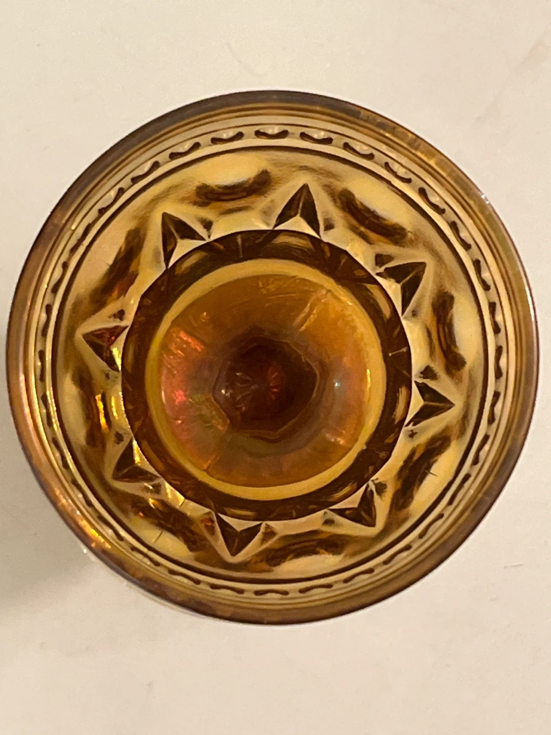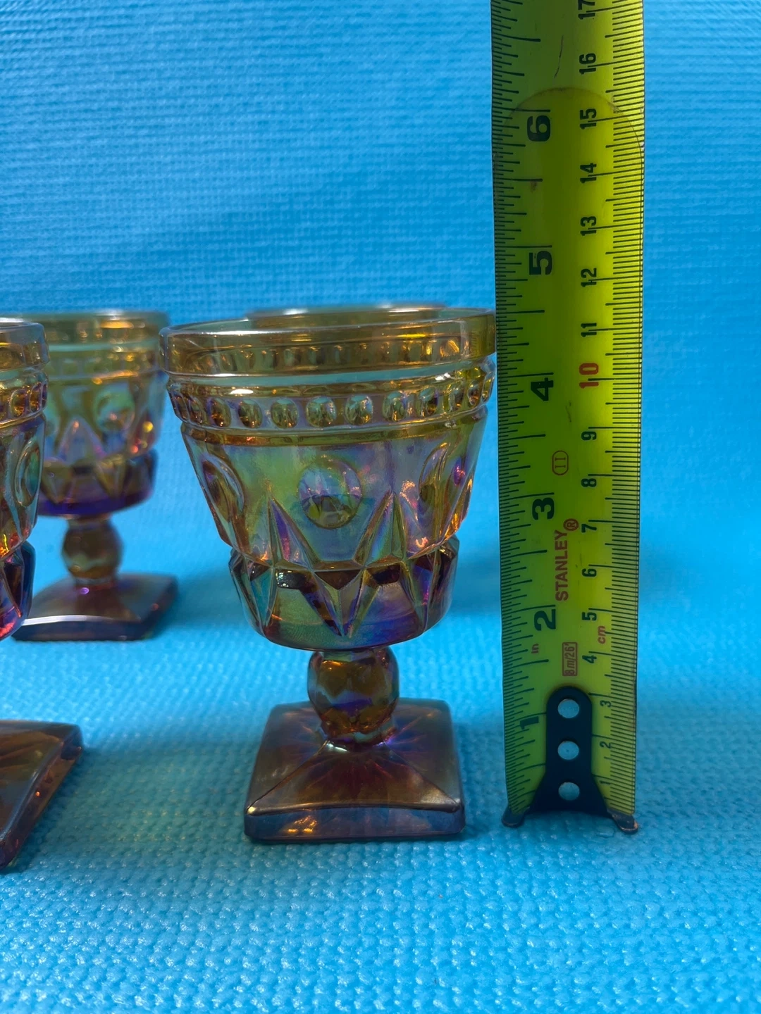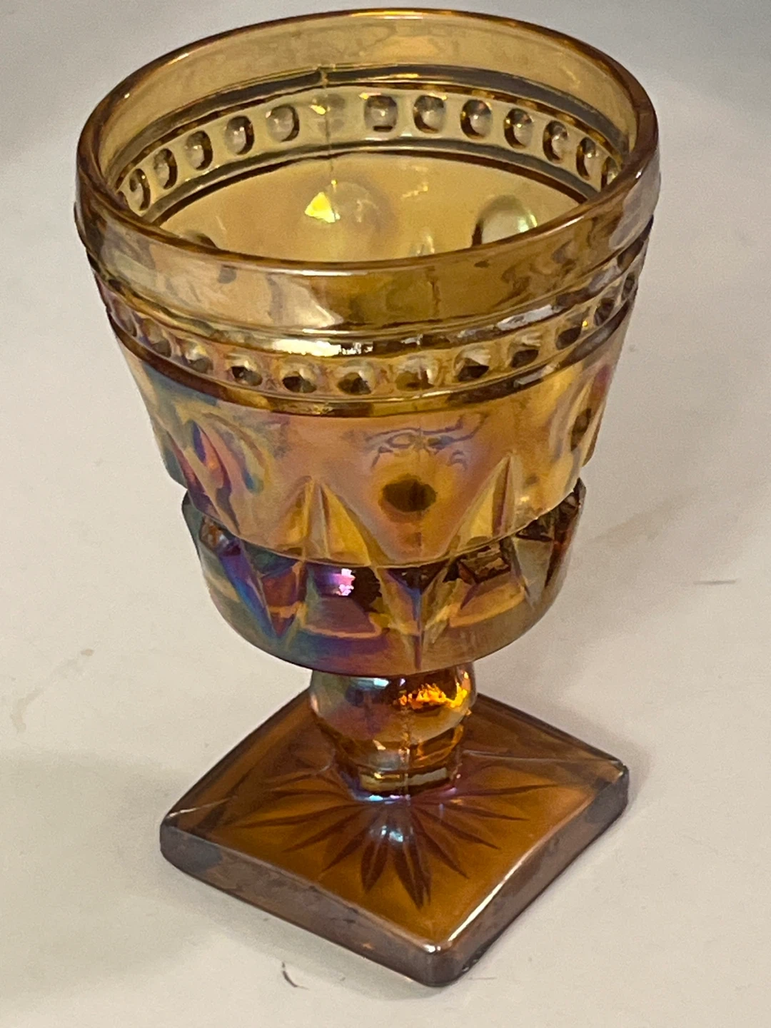 Stunning set of 4 vintage Indiana Glass "Colony Park Lane" goblets in a beautiful iridescent marigold (amber) finish. These pieces feature a classic mid-century geometric pattern and a unique square pedestal base.