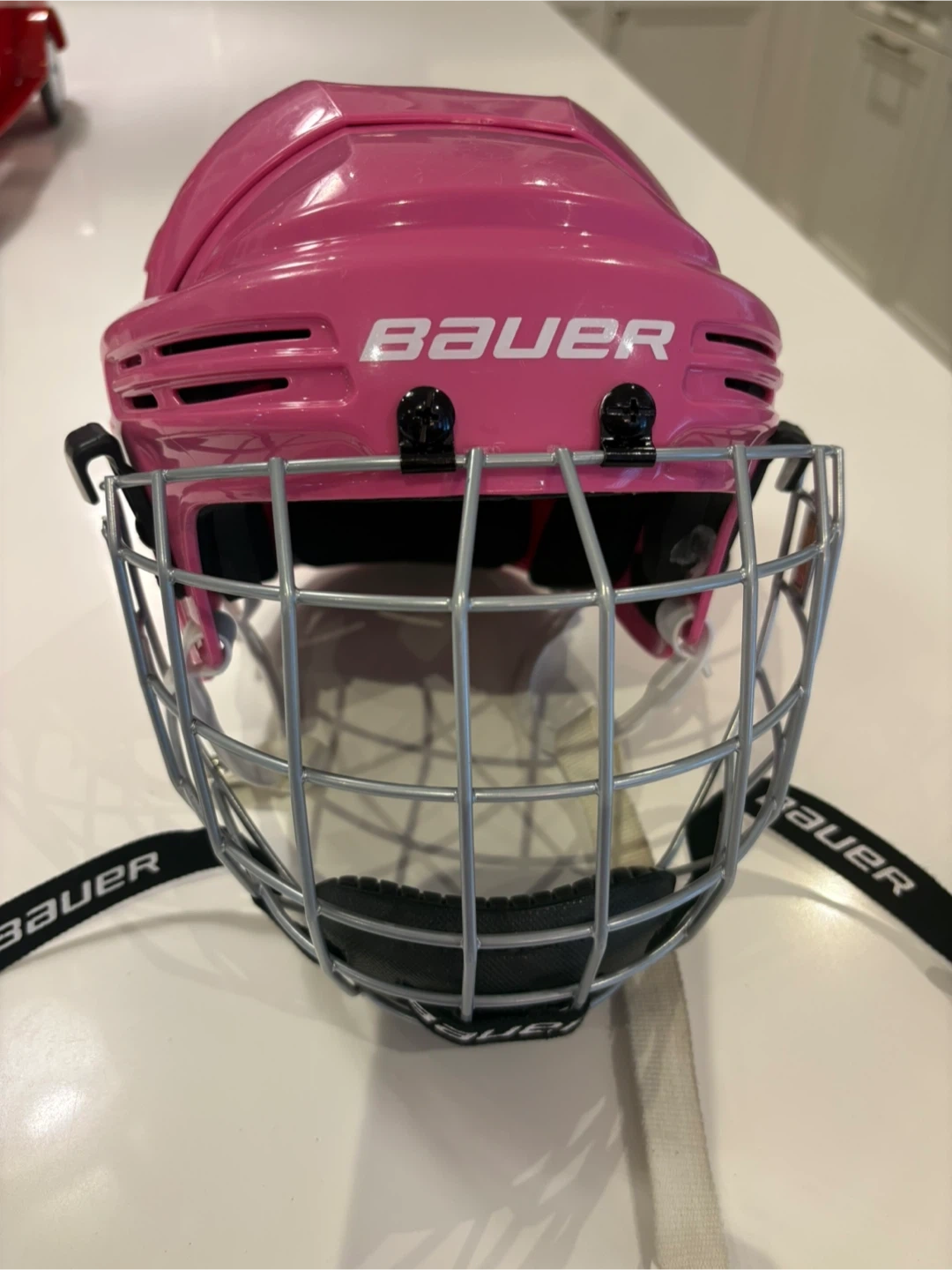 Selling a pink Bauer hockey helmet, complete with a cage! It's in good condition and ready for the ice. The helmet is HECC certified and valid until 2029.