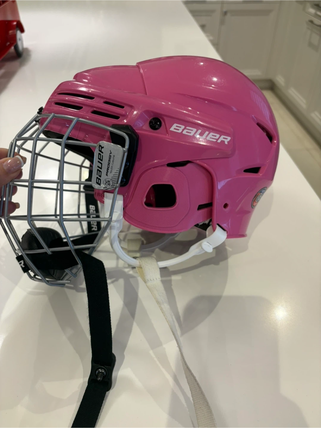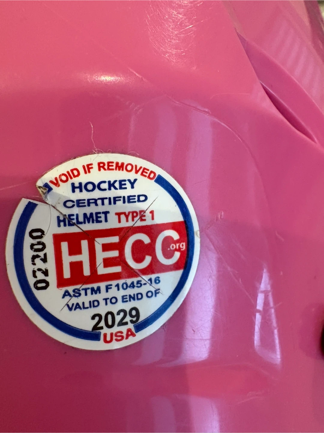 Selling a pink Bauer hockey helmet, complete with a cage! It's in good condition and ready for the ice. The helmet is HECC certified and valid until 2029.