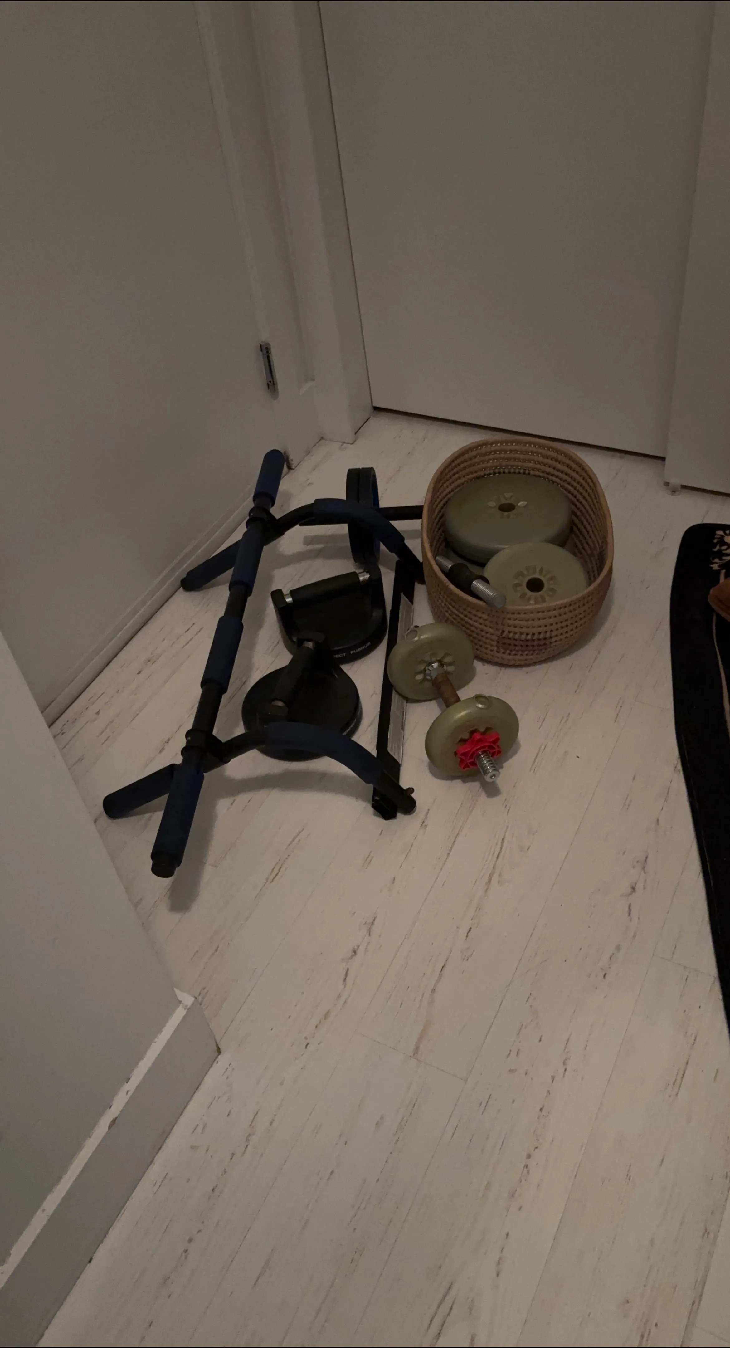 Selling a pull-up bar and a set of dumbbell weights. The pull-up bar is blue and black, and the dumbbell weights are green and grey. Great for home workouts!