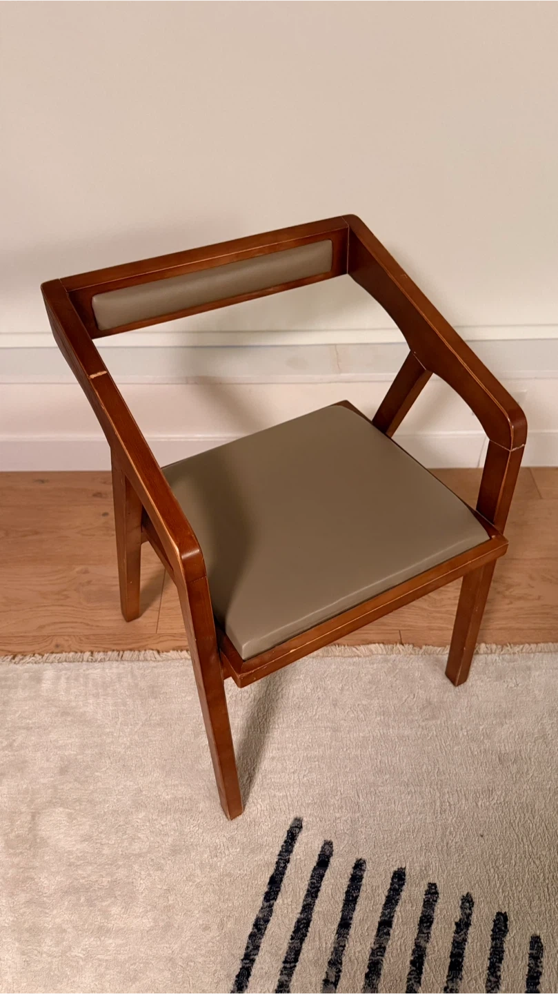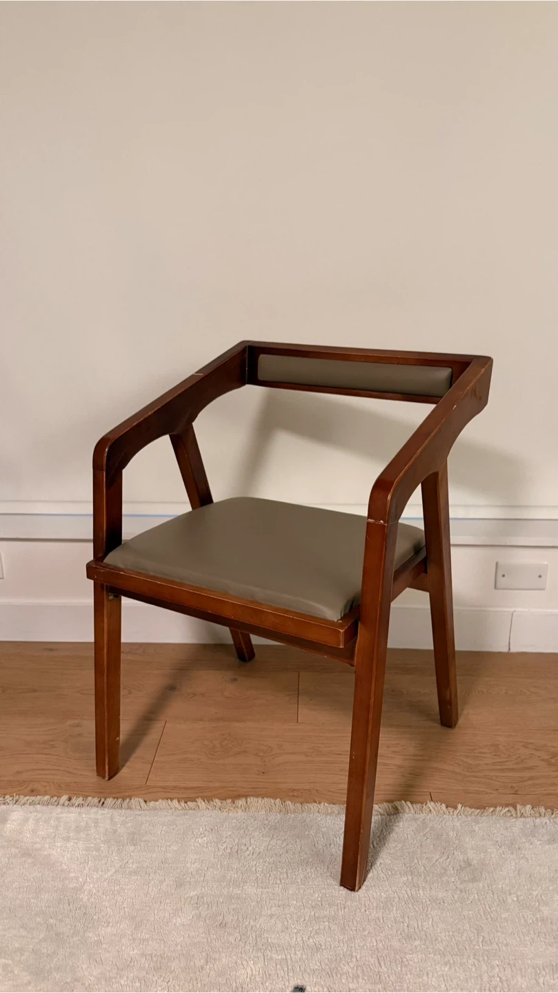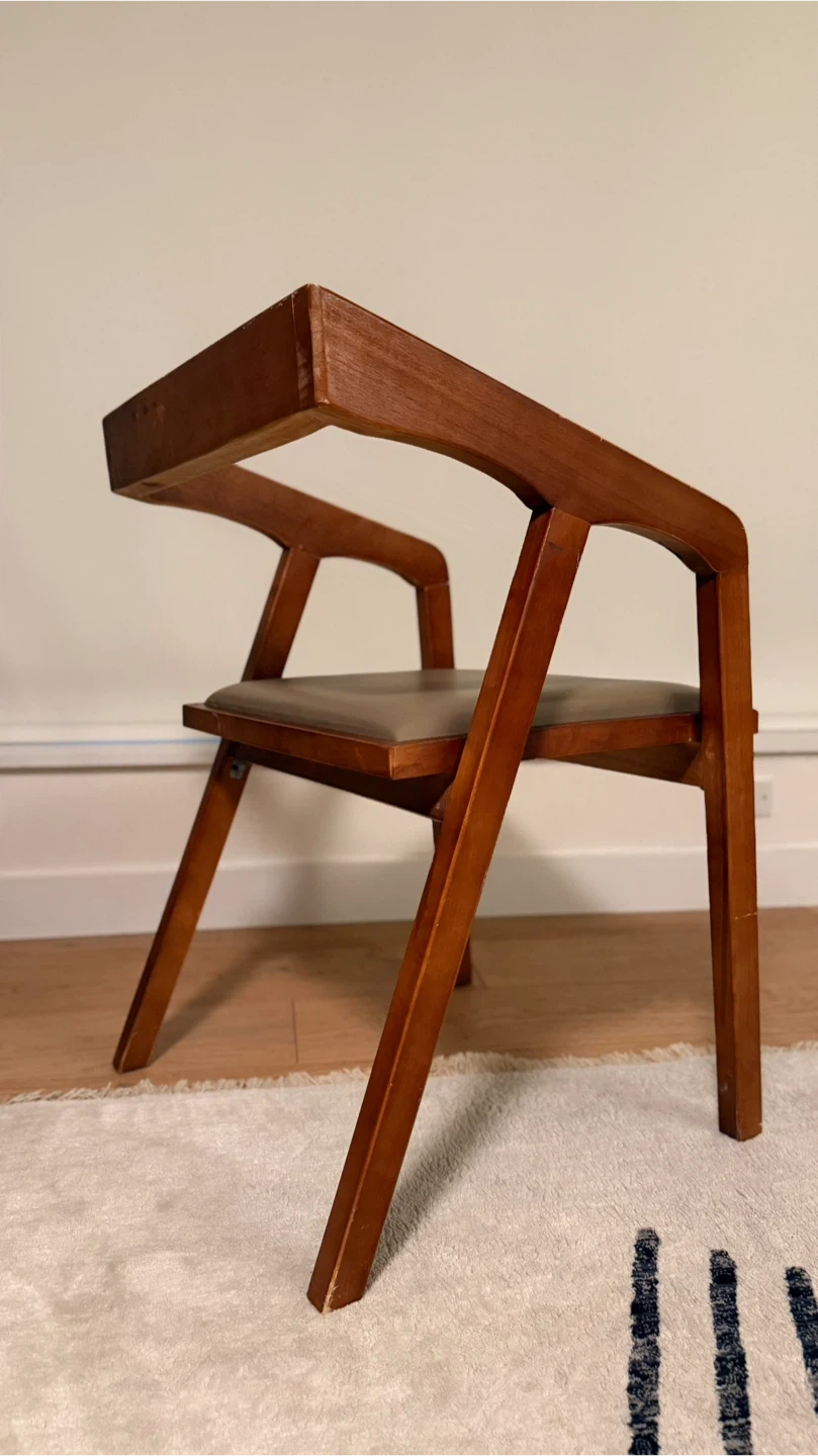 Solid wood accent chair with a comfortable upholstered faux leather seat. It features a unique, modern design that complements any room. Perfect for adding a stylish touch to your living space or bedroom.
