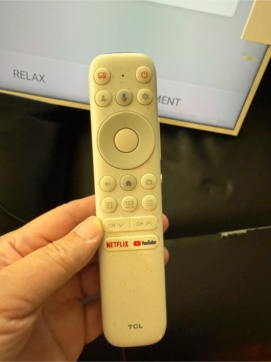 This is a TCL frame TV remote control. It has dedicated buttons for Netflix and YouTube. Power and volume controls are also included.