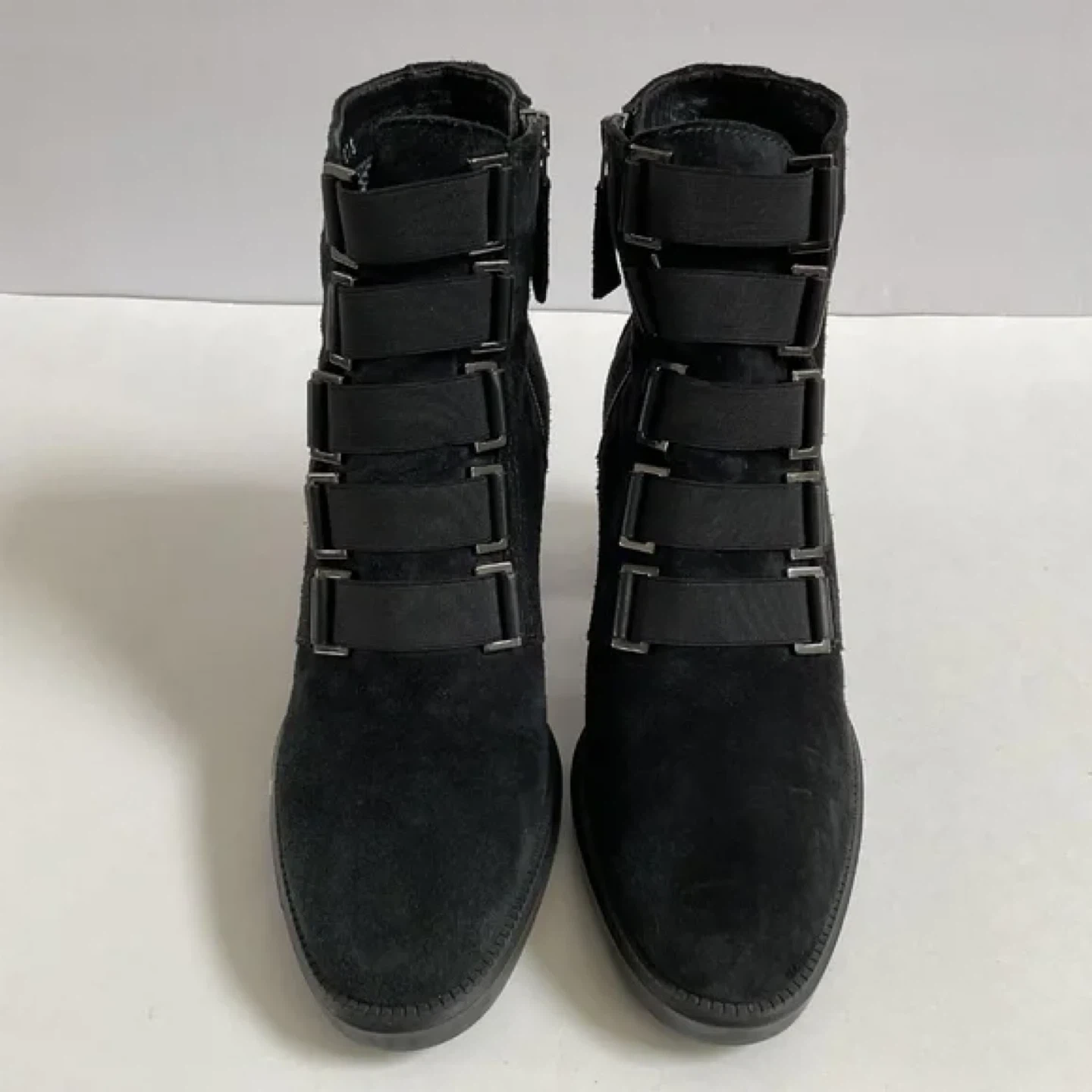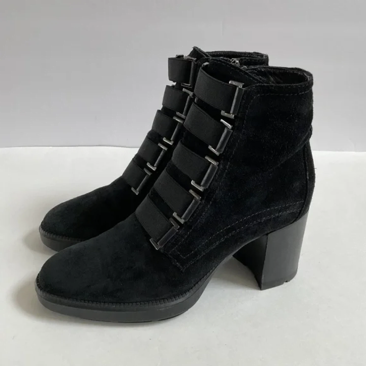 These Aquatalia ankle boots are a stylish addition to any wardrobe! They are made of black suede and feature a unique strap design. Size 10