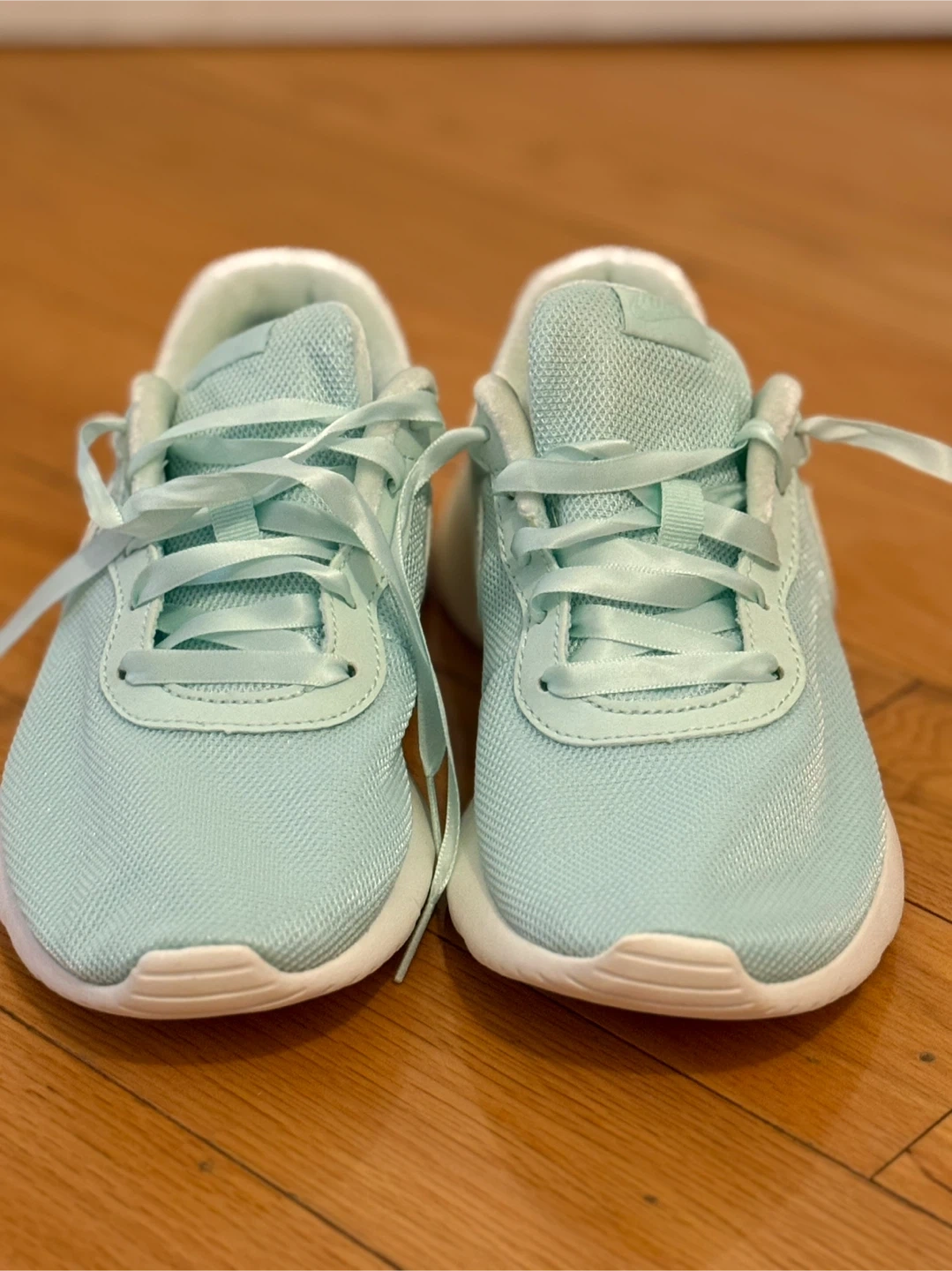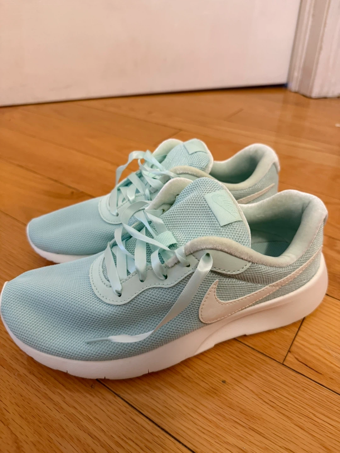 BRAND NEW/NOT WORN perfect condition- These Nike TanJun sneakers are a light aqua colour. They feature a breathable mesh upper and a comfortable rubber sole. Lace-up closure for a secure fit.