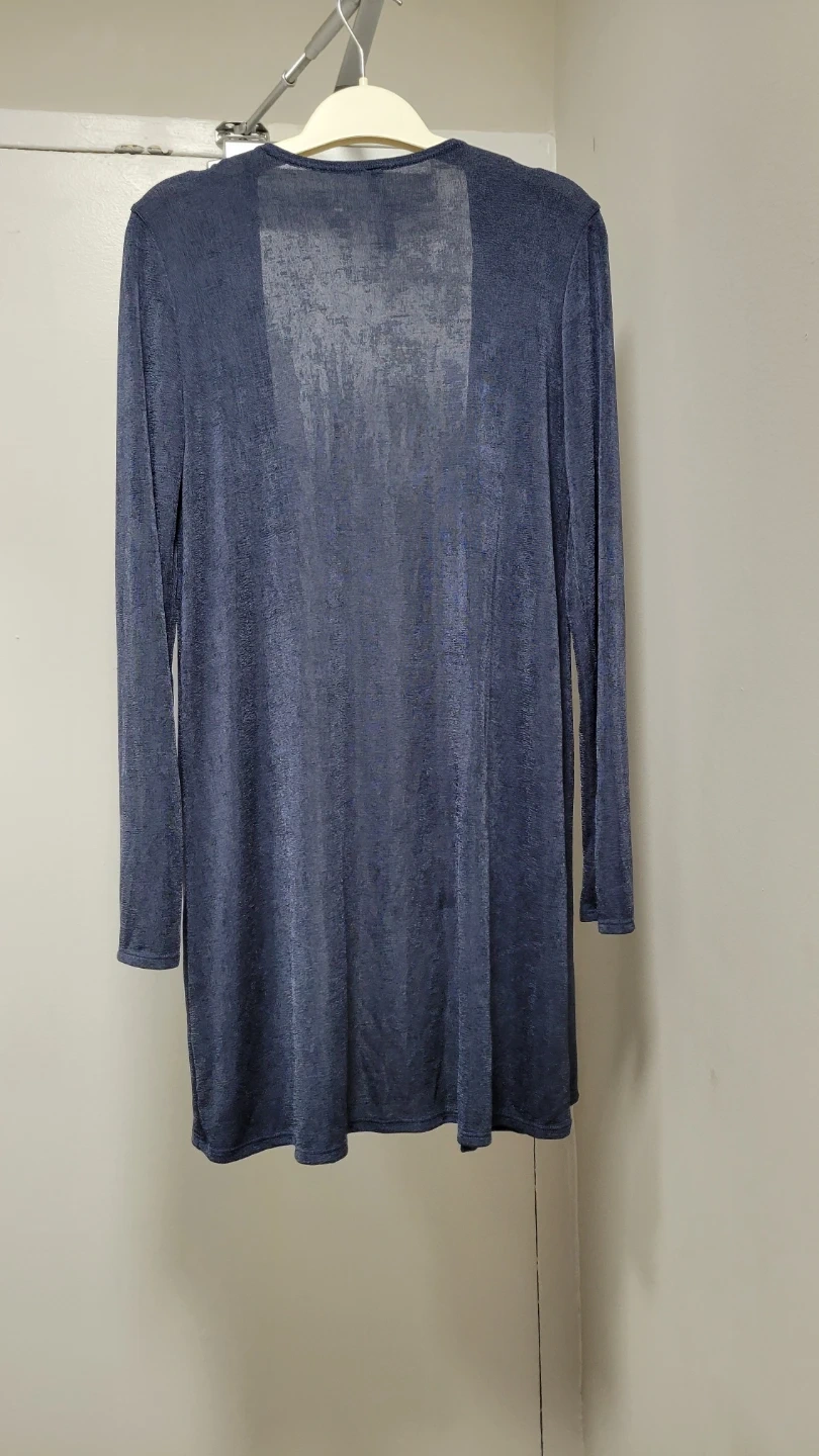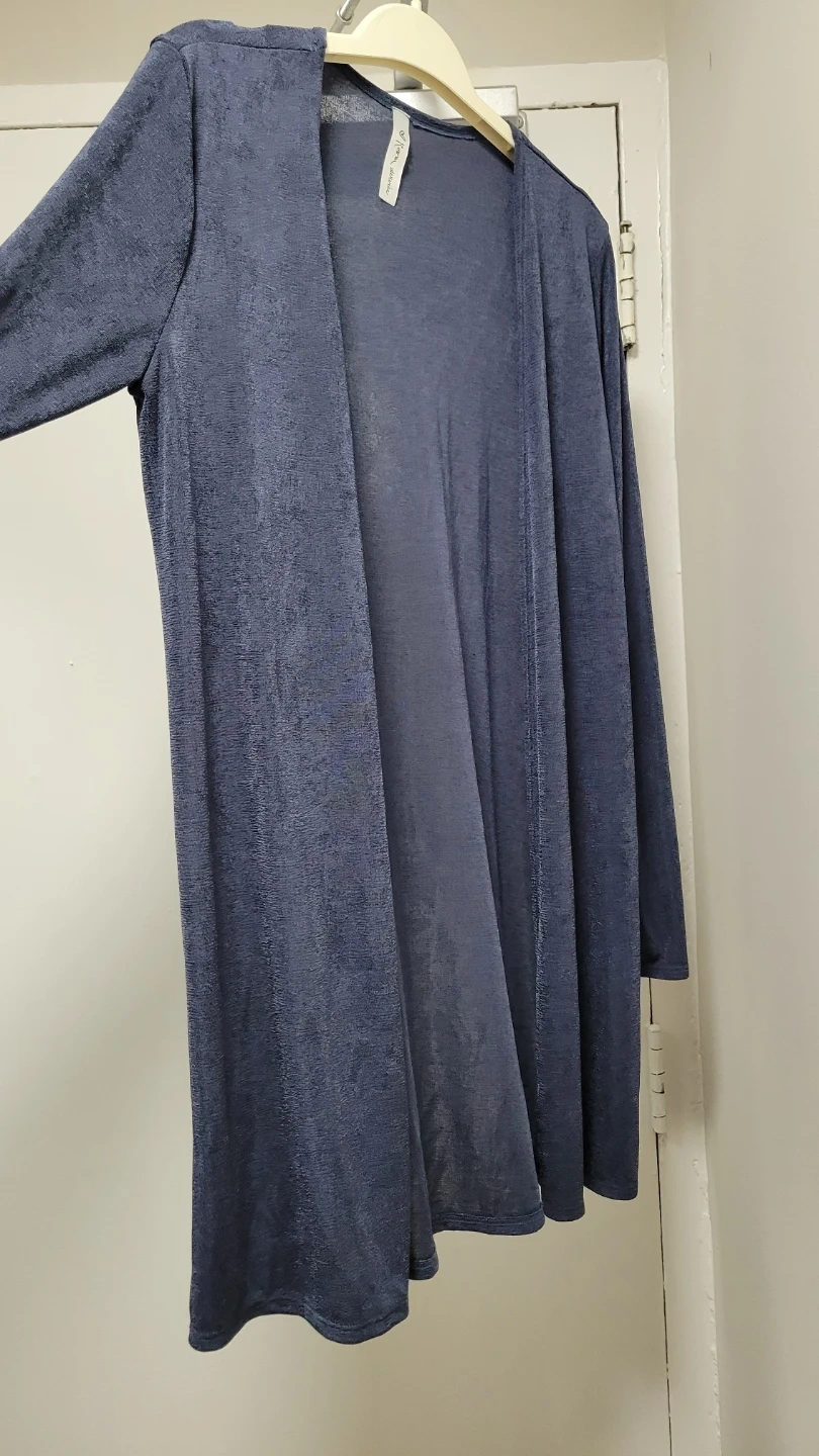 This is a "Room Service" blue open front cardigan. It's made of a soft, shimmering fabric. It has a long sleeve design and a mid-length cut.