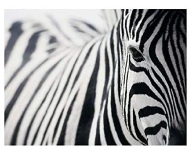 This is a striking zebra canvas print in black and white. It comes from Ikea. It is large -- about 4 feet by 2.5 feet. It is commercially printed on canvas fabric and stretched on a composite frame. It is a statement piece