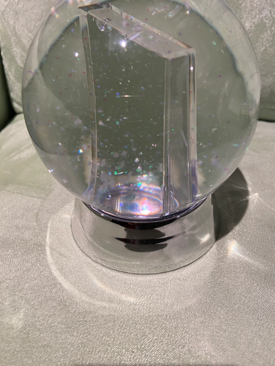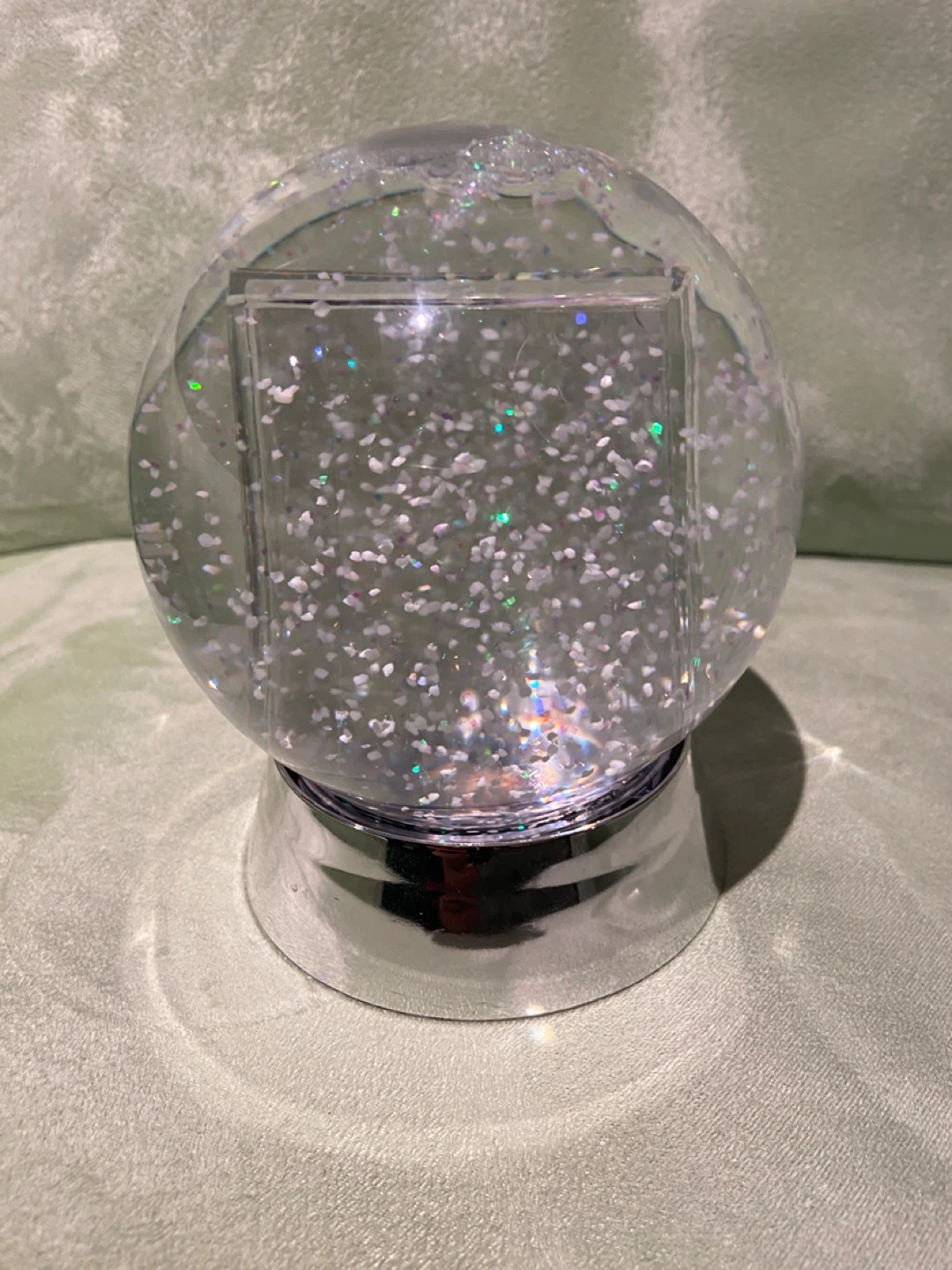 I'm selling a picture water globe. It has a silver base and is filled with water and glitter. It would be a nice addition to any room!