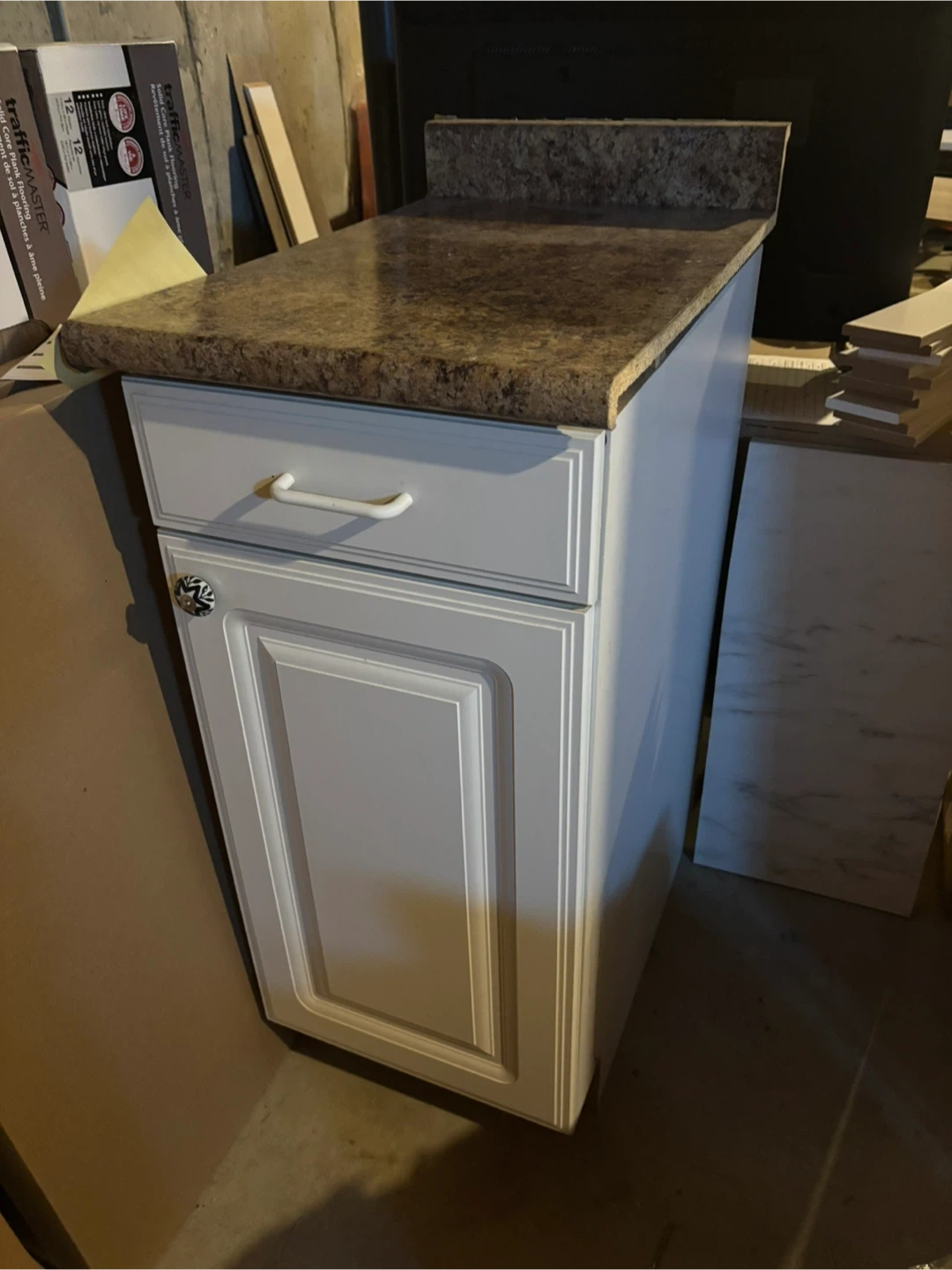 This is a white base cabinet with a single drawer and a cabinet door. It has a speckled countertop. The cabinet is made of wood and the countertop is laminate. Good for garage/cabin.