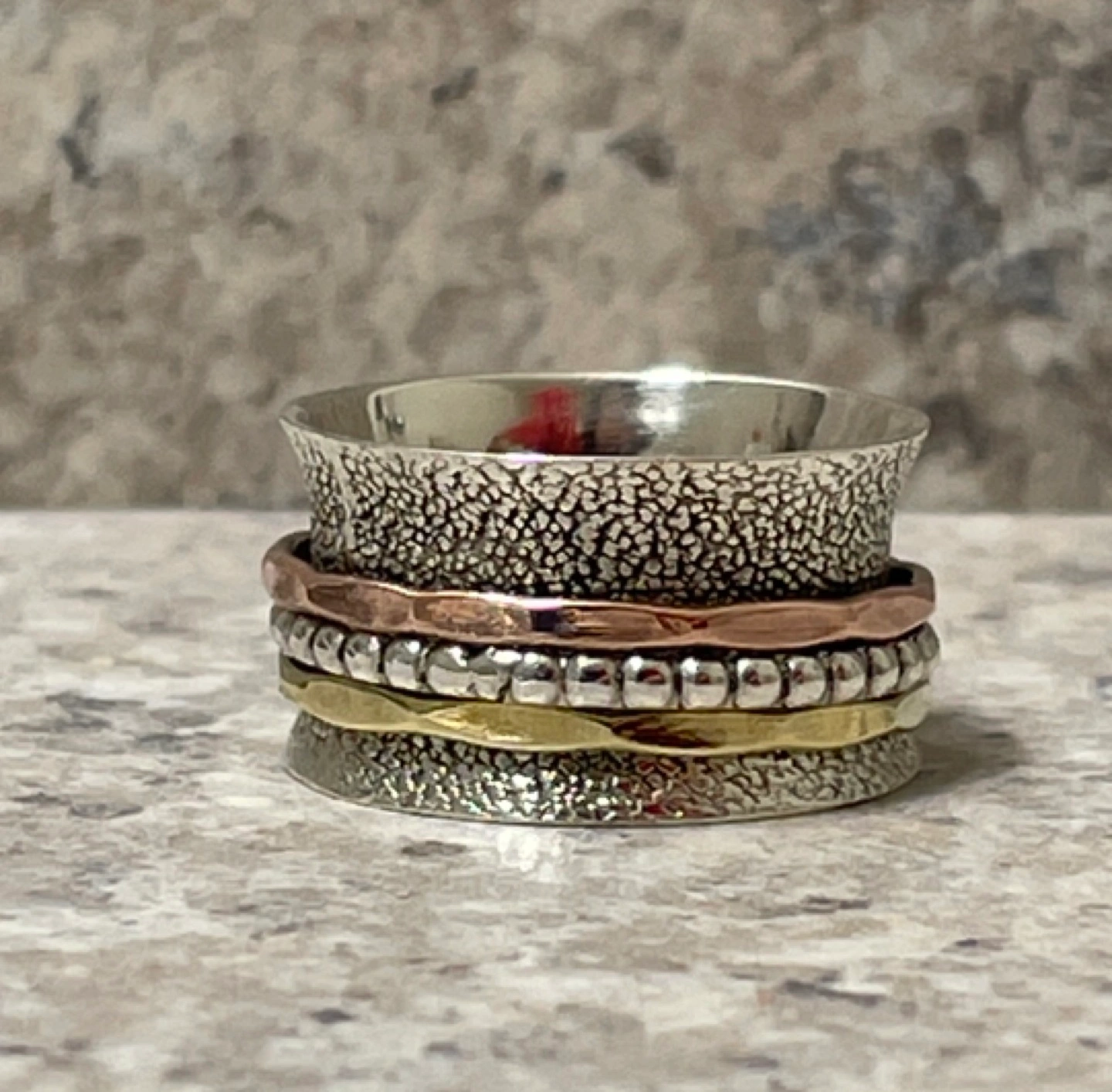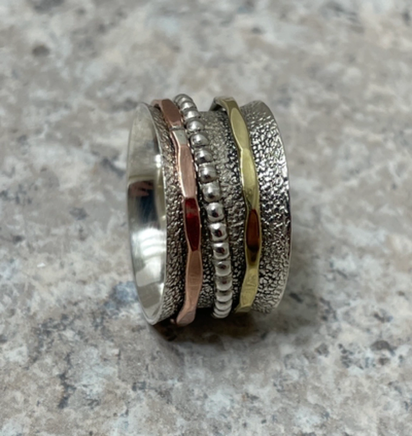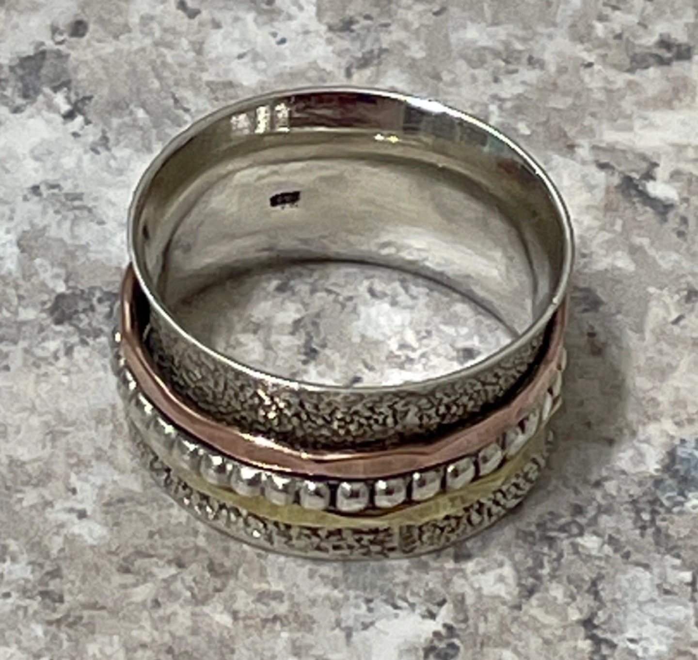 • like many meditation ring, there is either 1 or more inner rings that can be moved and turned. There are 3 on this ring. All are 925 sterling silver too, but the top and bottom are plated with Gold or Bronze.