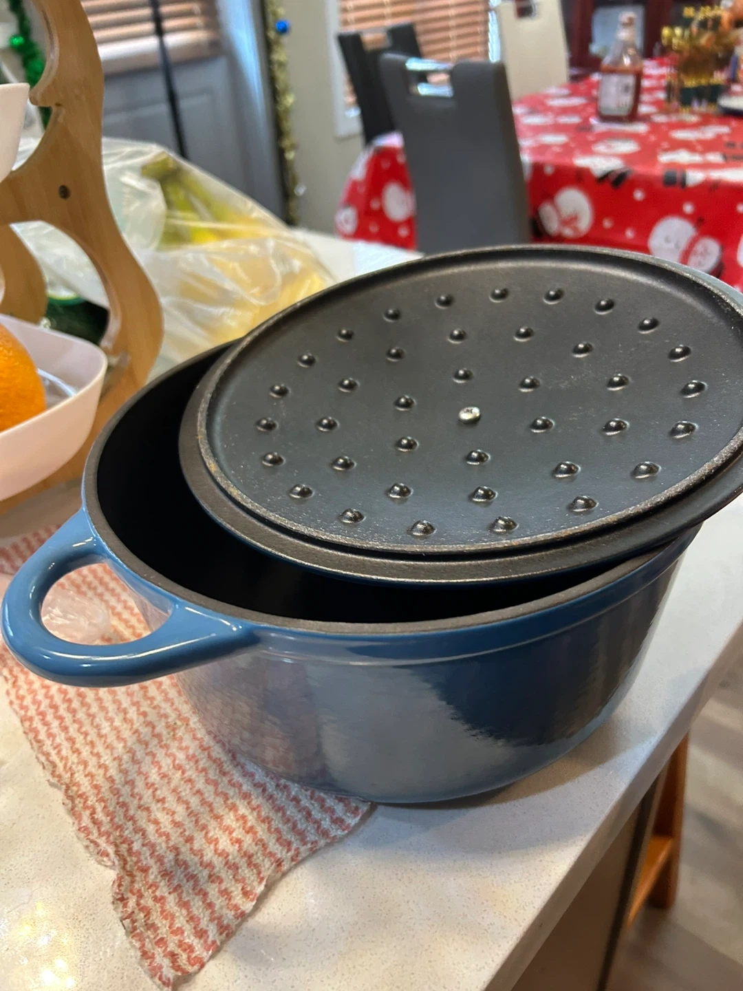 Kurogama 5.5-quart enamel cast iron Dutch oven in a lovely blue colour. It's great for stews, roasts, and baking bread. This pot is perfect for slow cooking and retaining heat.
