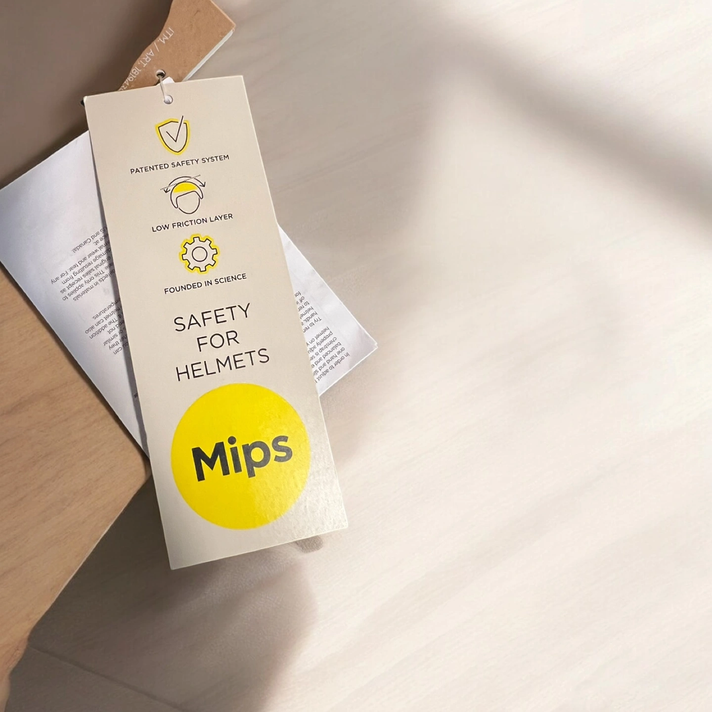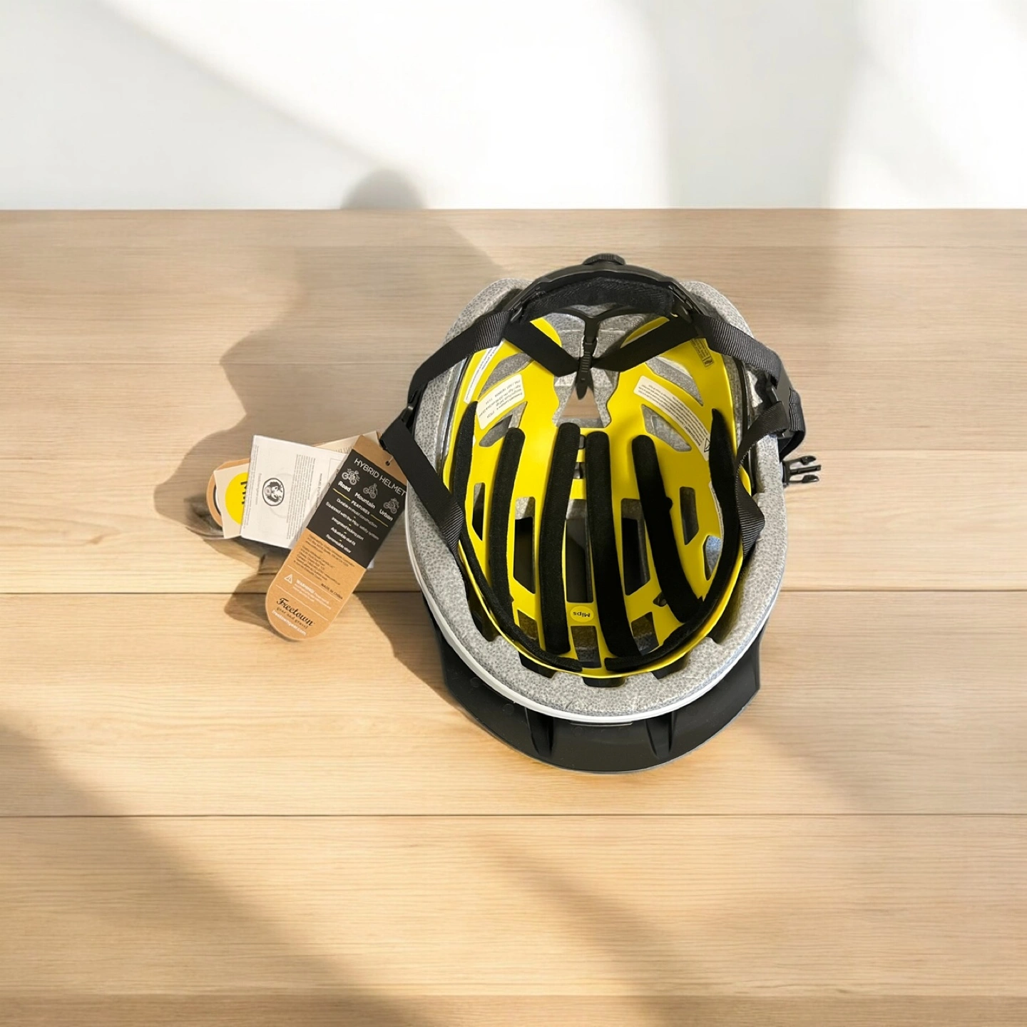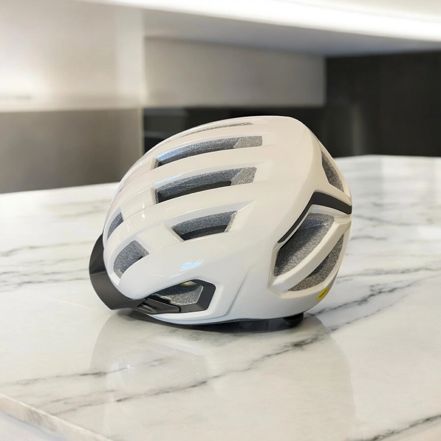 White hybrid cycling helmet. Features MIPS safety system. Durable in-mold construction. Integrated locking port. Adjustable dial fit. Removable visor. Suitable for road, mountain, and urban cycling.