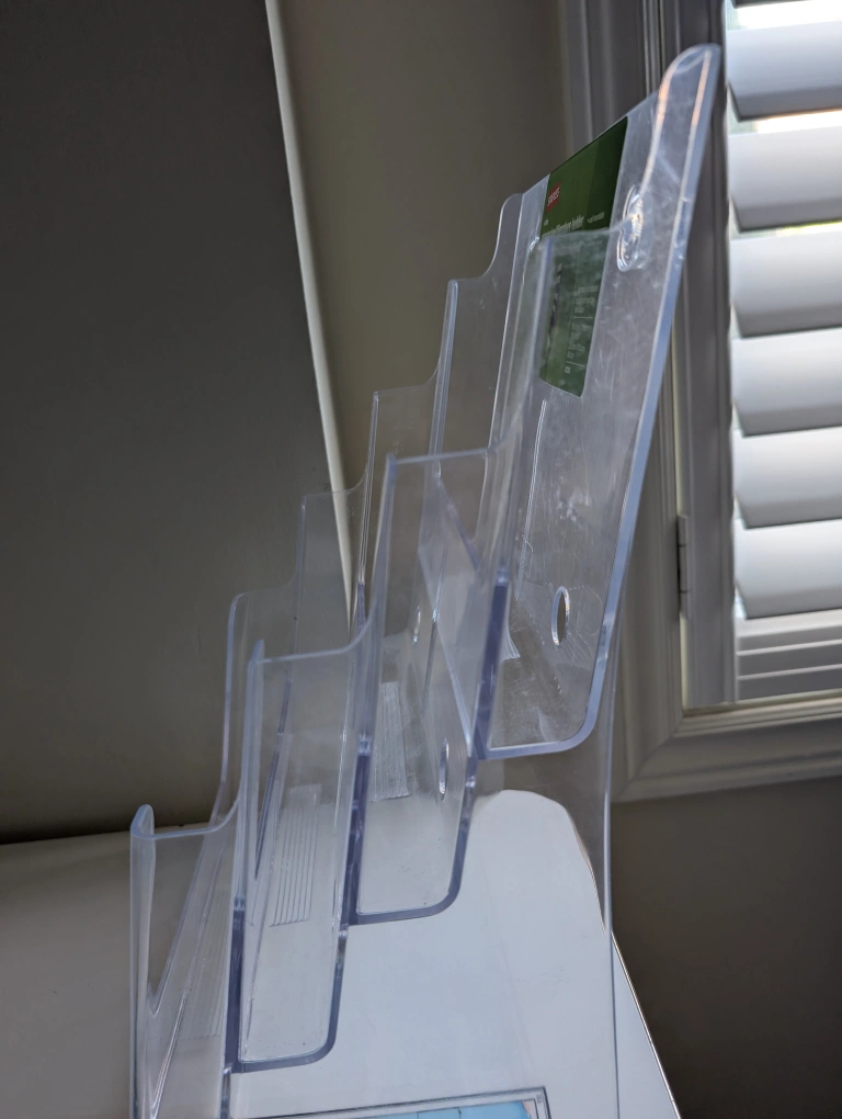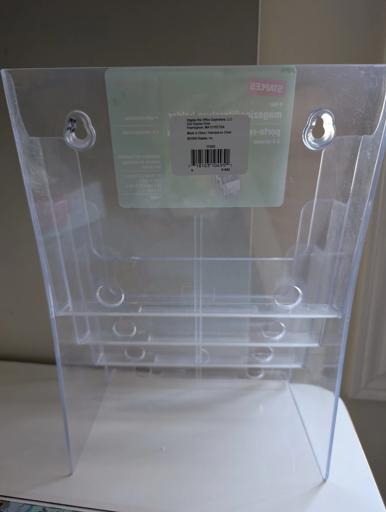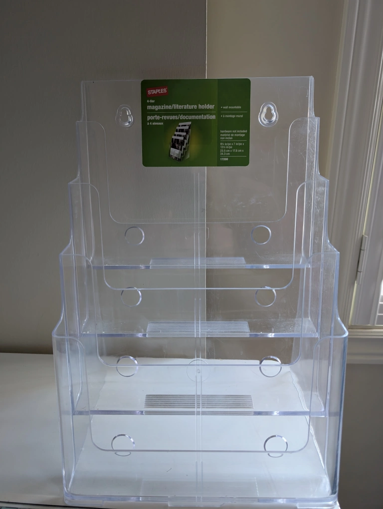 Selling a clear Staples 4-tier magazine and literature holder. It's perfect for organizing documents and magazines in your home or office. It's brand new and ready for a new home